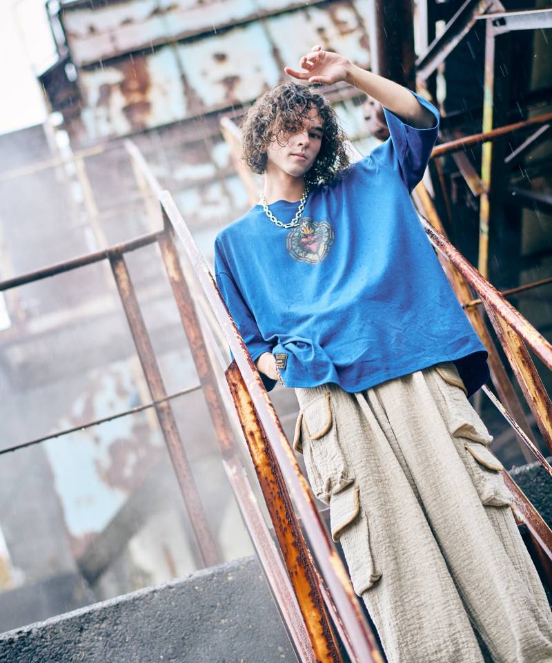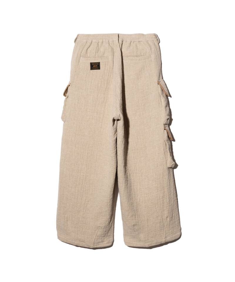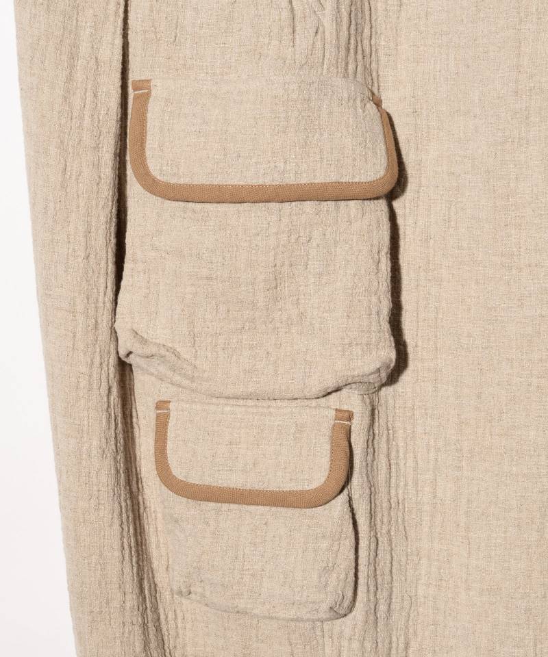 ミリタリーパンツにエアリーなテキスタイルを落とし込み、今季のコレクションテーマである“Shadow of the Wind”の陰影ある世界観を表現したLinen Cargo Pants。テキスタイルに用いたのはムラ感あるテクスチャを持ったスラブ混リネンを素材にしたダブルガーゼ生地。空気を含んだようなボリュームと軽さある風合いが季節感を捉えたスタイリングを楽しませてくれます。アシンメトリーにポケットを配したボディは腰元に1タック、裾にダーツを加えることでバルーン状のボリュームを持たせたワイドシルエット。裾のドローコードや後ろ身頃のゴムウエストなど、快適なスタイリングをアシストするディテールを上下にあしらいました。