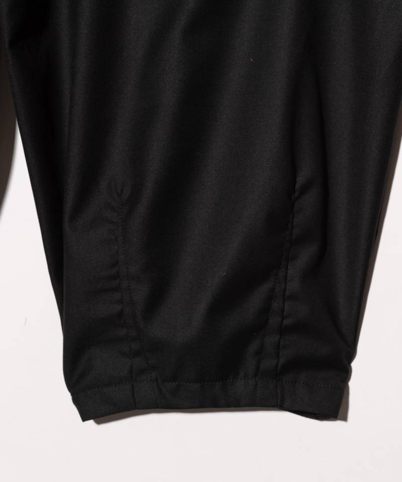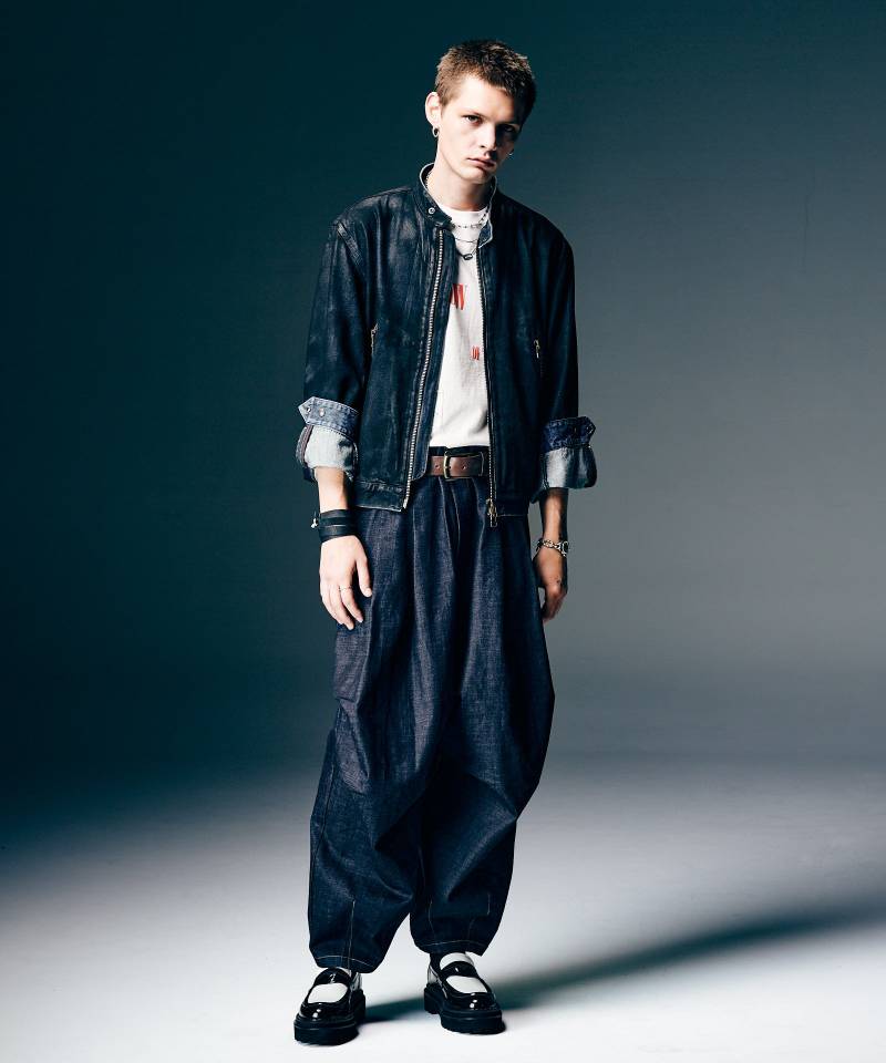 コレクションの度に好評を博すタック使いのバギーシルエット、そこへ不動のベーシック生地2種を落とし込んでglambならではのネオベーシックを提案するCrossover Tuck Pants。ボディは腰元に4タック、膝に2タック、裾にダーツを設けて構築したワイドバルーンシルエット。レングスは九分丈に設定しており、着用すると足元にオフバランスな視覚効果を演出します。2色展開となる本作では、Blackには滑らかな落ち感がレーヨン混スーツ地、Indigoにはクリーンなルックスのノンウォッシュデニムを使用。今季のglambでは和装のエッセンスを大胆に取り入れたKimono Denim Jacketを同生地でラインナップ、野心的なセットアップスタイルもお楽しみいただけます。
