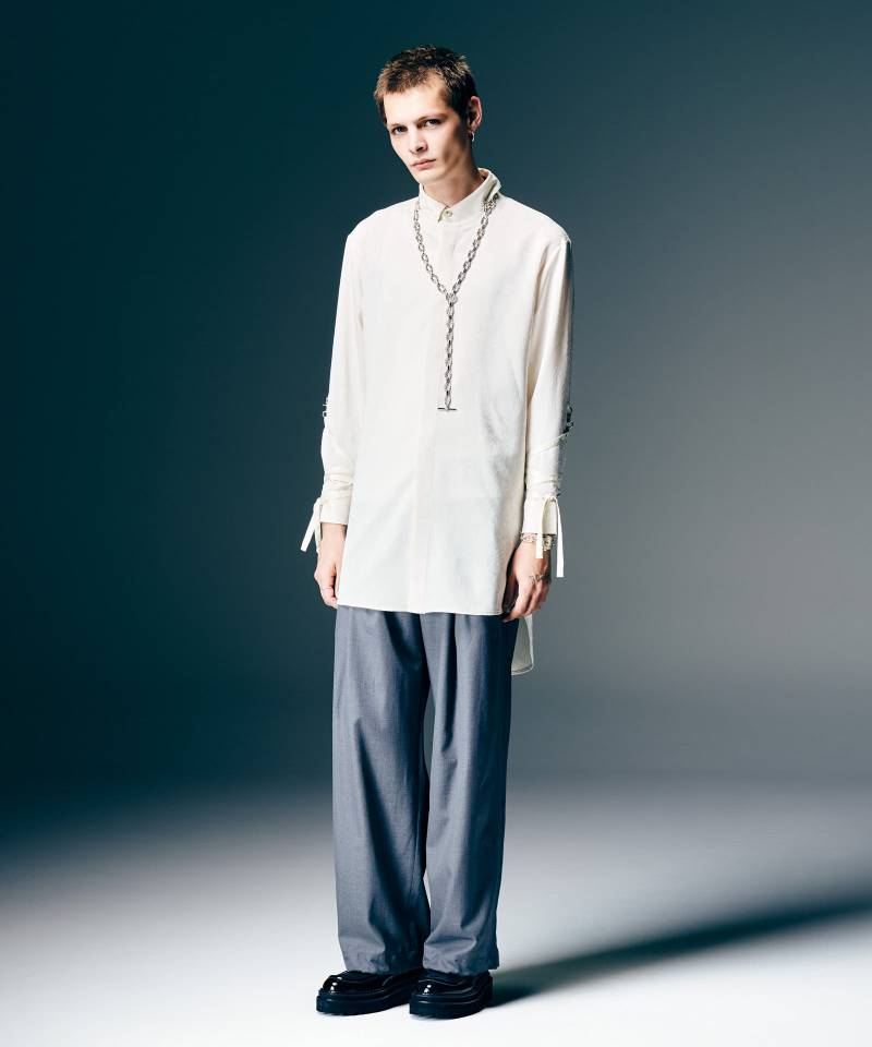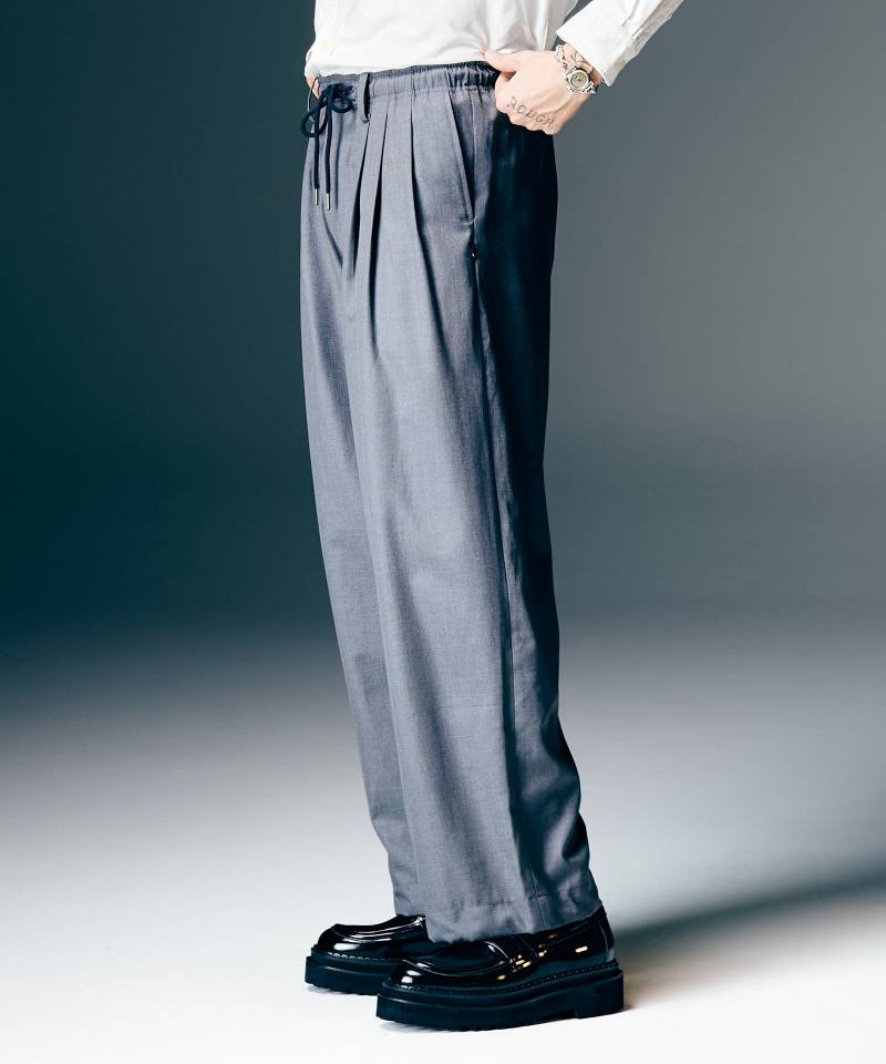 スラックスにブランドならではの自由なスポーツミックスを掛け合わせたAdjustable Balloon Slacks。テキスタイルにレーヨン混の落ち感あるスーツ生地を用いながら、ボディは左右6本ものタックでバルーン状に構築したバギーシルエットに。ウエストのドローコード仕様に加え、ゴム仕様の裾はスピンドルで幅調整が可能となっており、シチュエーションやコンディションに合わせて着心地をアレンジいただけます。