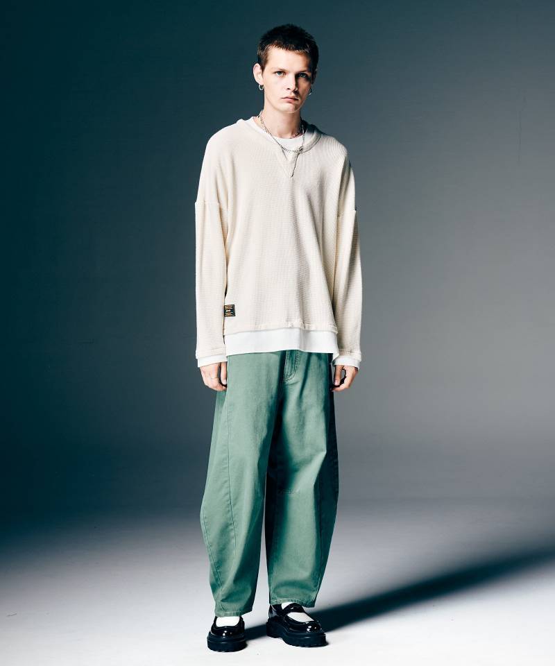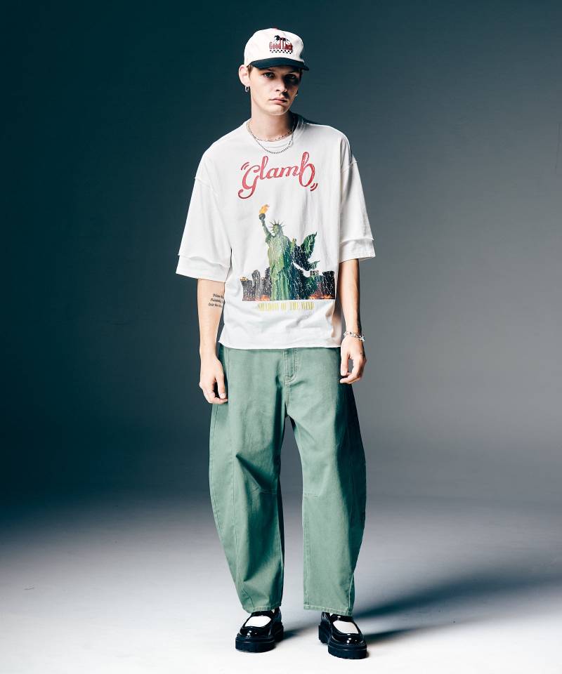 glambの独創的なワイドシルエットメイキングをカラーコーディネートで提案するColor Barrel Denim。バルーン状のシルエットは丸みを帯びた輪郭に合わせて前身頃を2パネル使いで構成。さらに裾内側にダーツを加えた立体的なパターンによって表現しています。4色展開となるカラーバリエーションはいずれもアッシュがかった色調で展開。アイコニックなルックスだからこそ、プレーンなトップスと合わせた抜け感あるスタイリングがおすすめです。