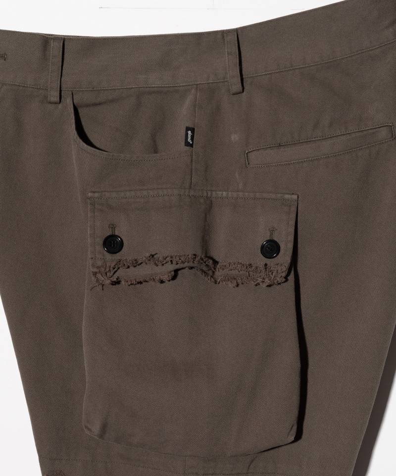 ショーツにハードなダメージを掛け合わせ、春夏のイージースタイルにglambならではのグランジィなテクスチャを乗せるCrush Cargo Shorts。股上を深く設けたテーパードサルエルボディは、大振りなカーゴポケットがアクセント。フラップはカットオフ、裾はクラッシュを加えた後に仕上げのワンウォッシュを施してダメージを表出。裾は中厚手のコットン生地を2枚使いにすることで、クラッシュのほつれを最低限に抑えながら、膝の透けも抑えるという質実備えたディテール使いとなっています。