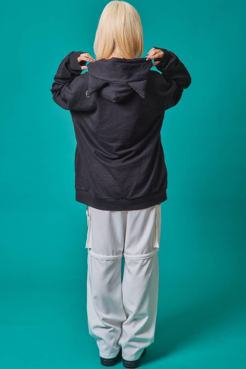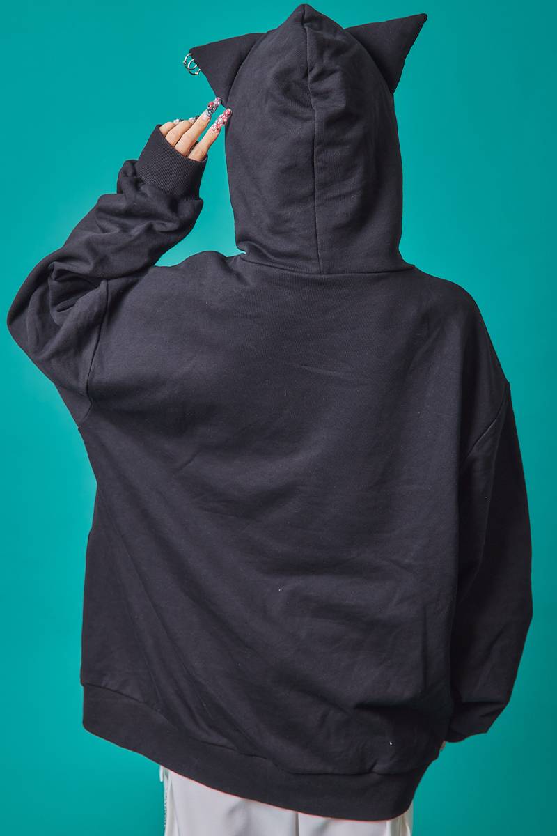 フードには「DEVIL CAT」の猫耳付きで、被った時にもポイントになるデザインです。