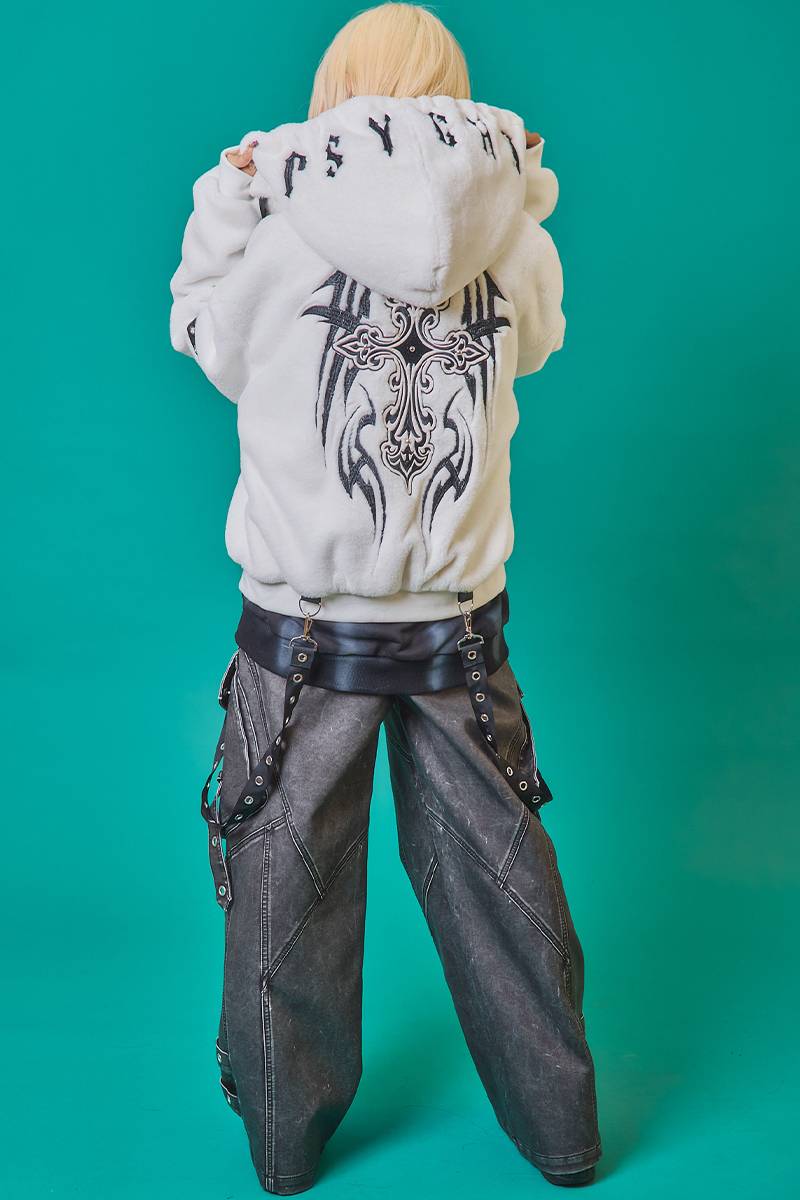 バックはトライバル調のクロスモチーフ刺繍をガッチリ入れ、フードにもブランド・ロゴを刺繍で刻んだインパクト抜群のデザイン!