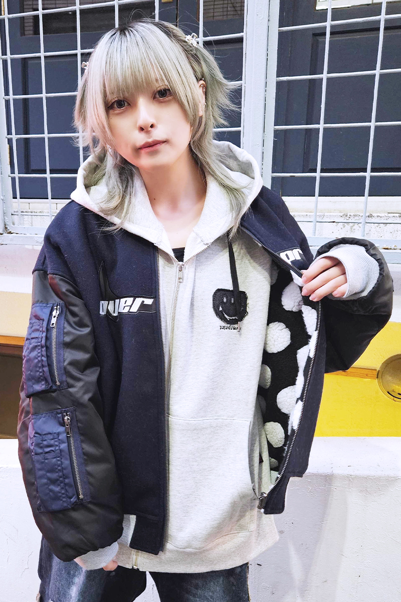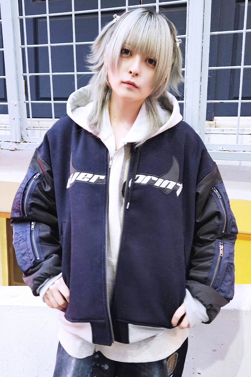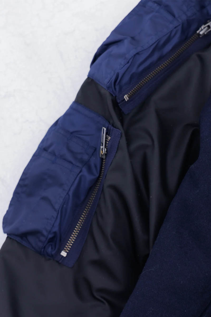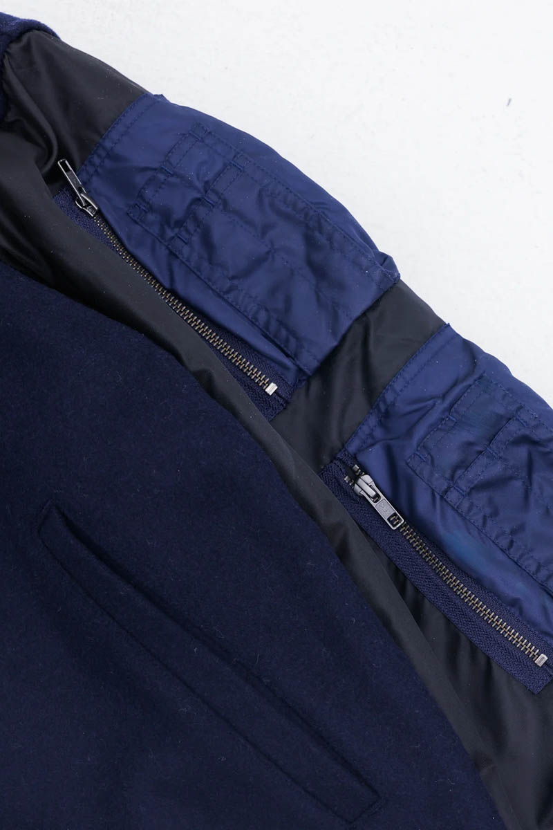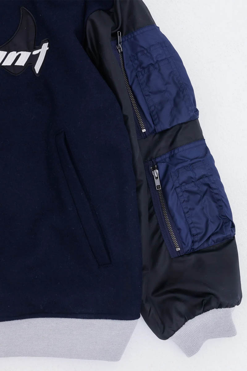 ウールメルトン生地、高密度サテンによるデザイナーのアメカジ愛を詰め込んだスタジャンをドッキングしたようなデザインのMA-1ジャケット。