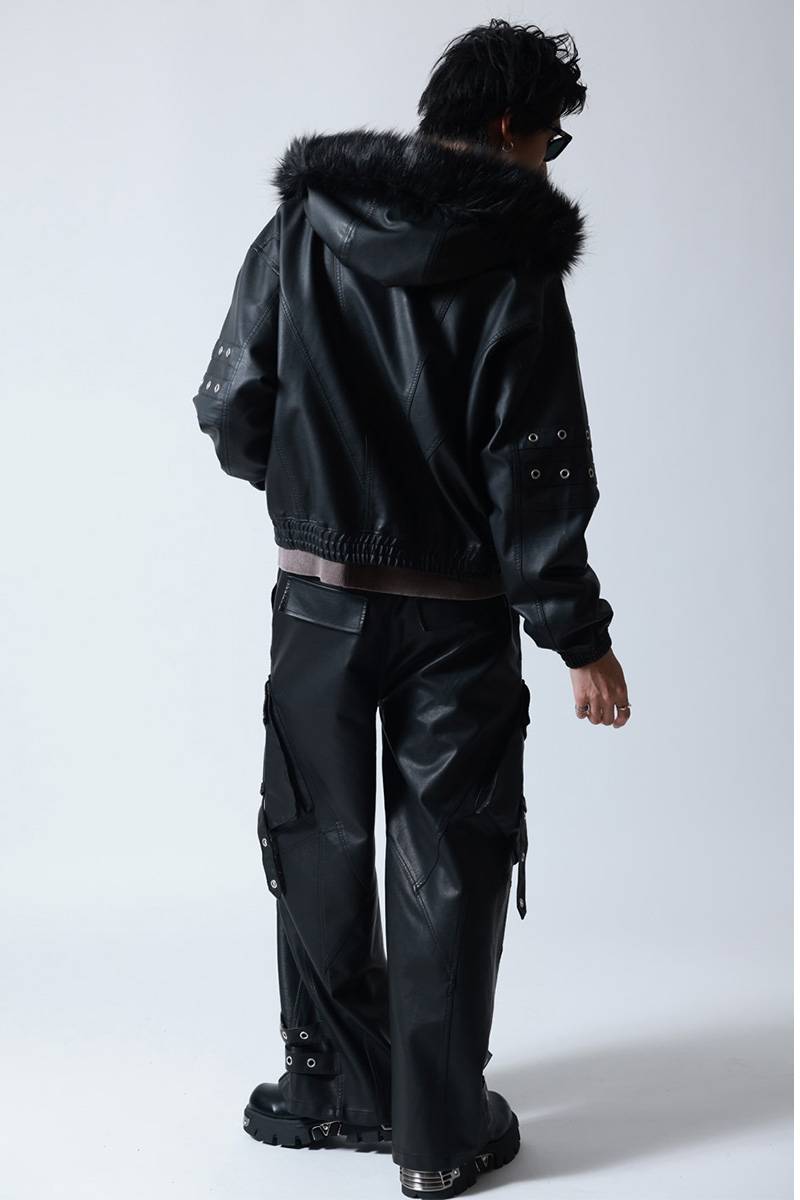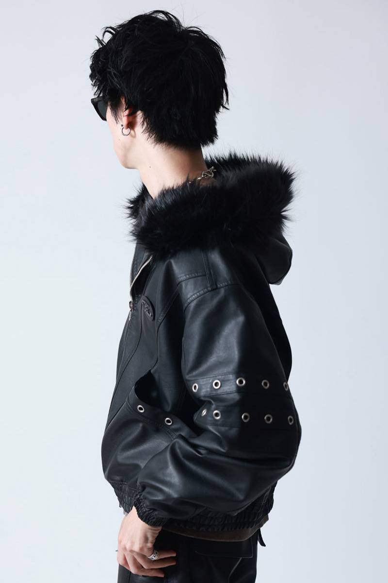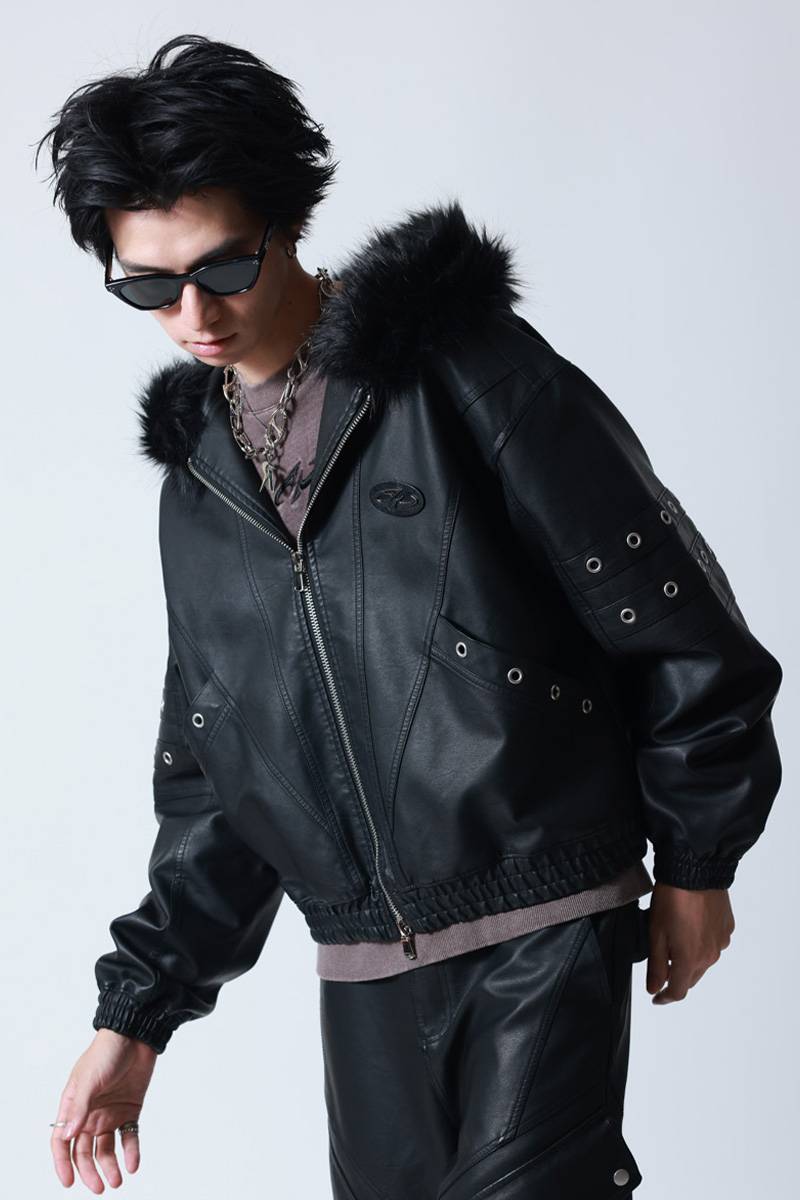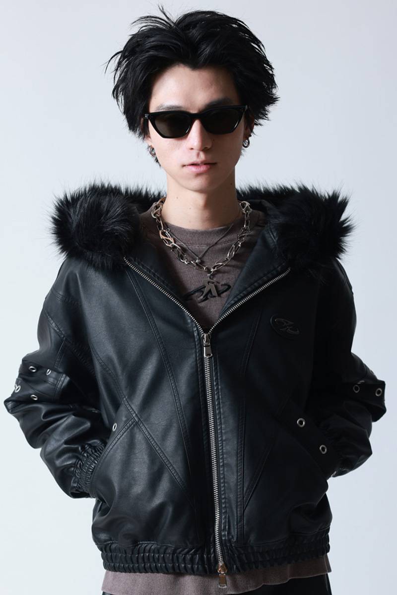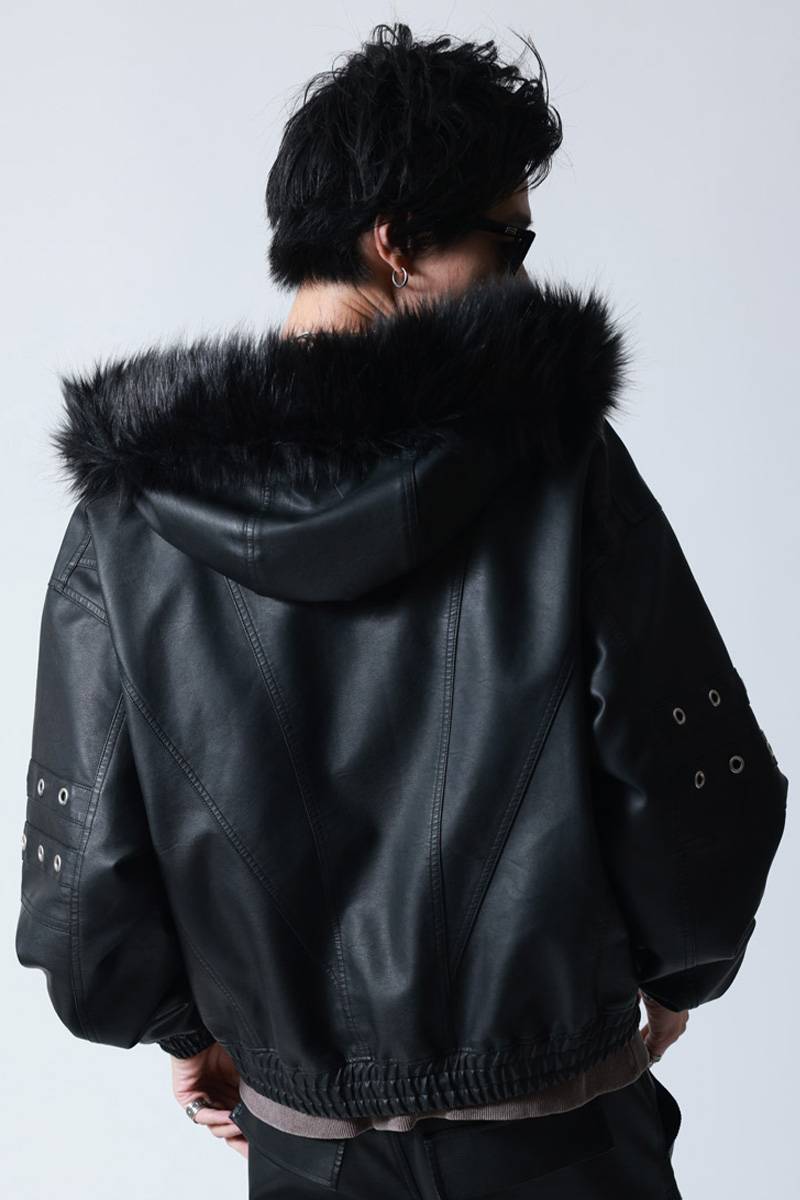 フードに毛足の長いファーを取り付けたシンセティック・レザー・ジャケットが登場!