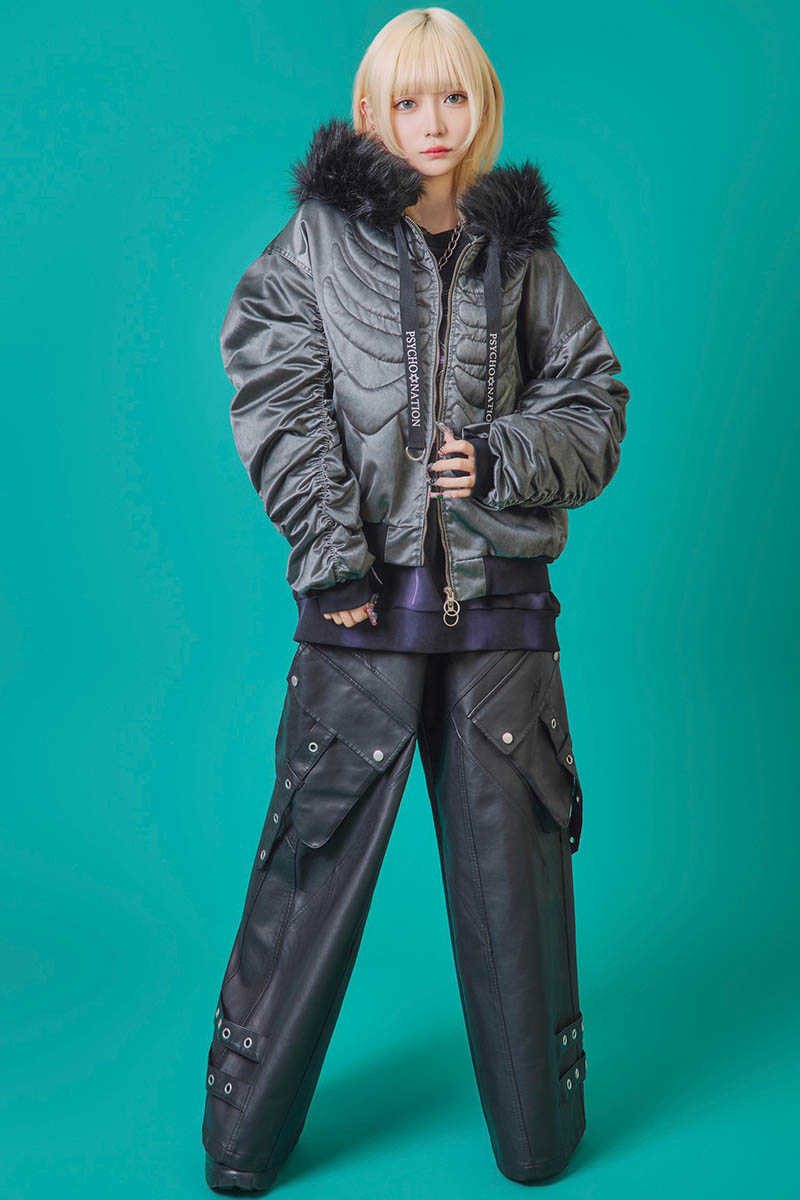 モノトーンやダーク系コーデはもちろん、Y2K・サブカル系ファッションにもマッチする、主役級アウターです。