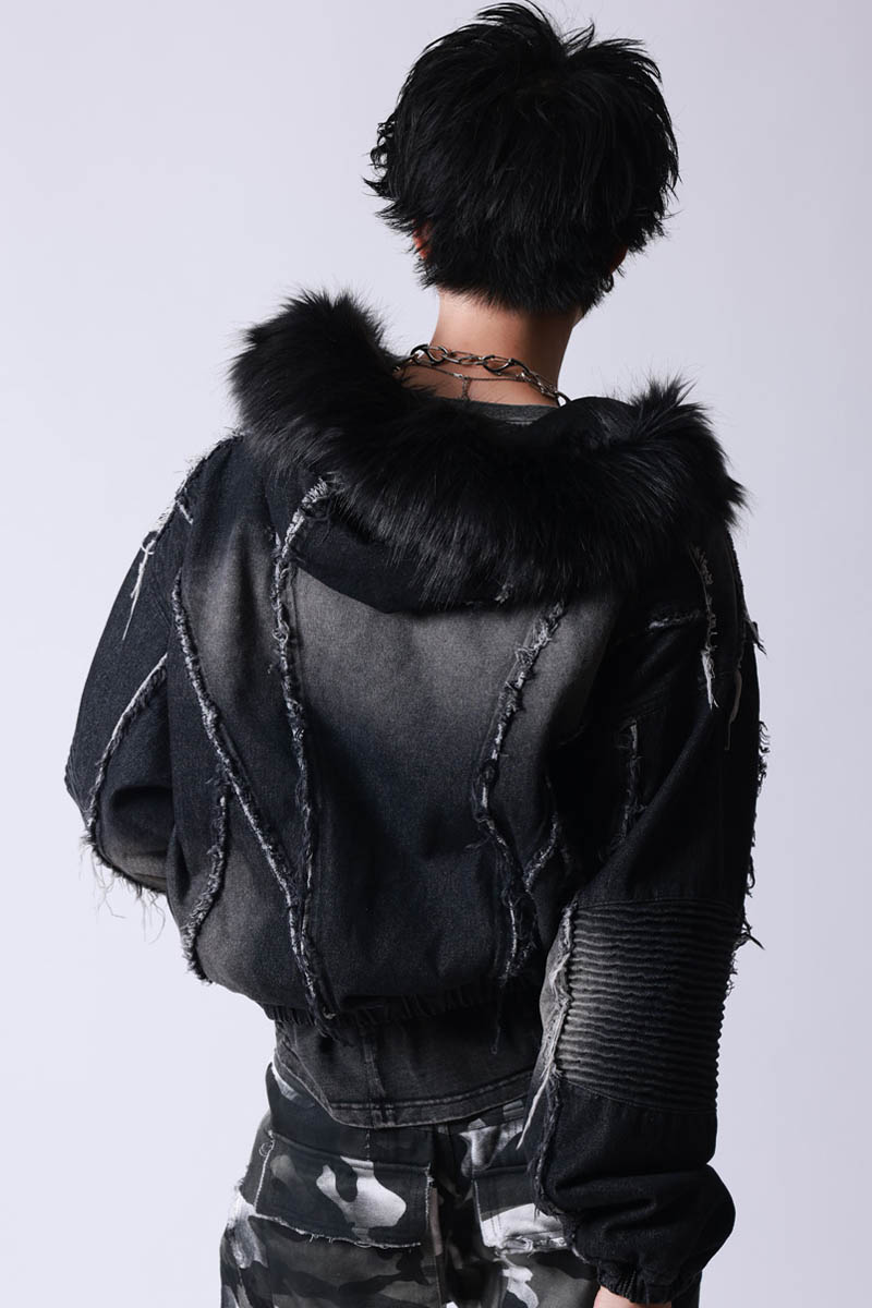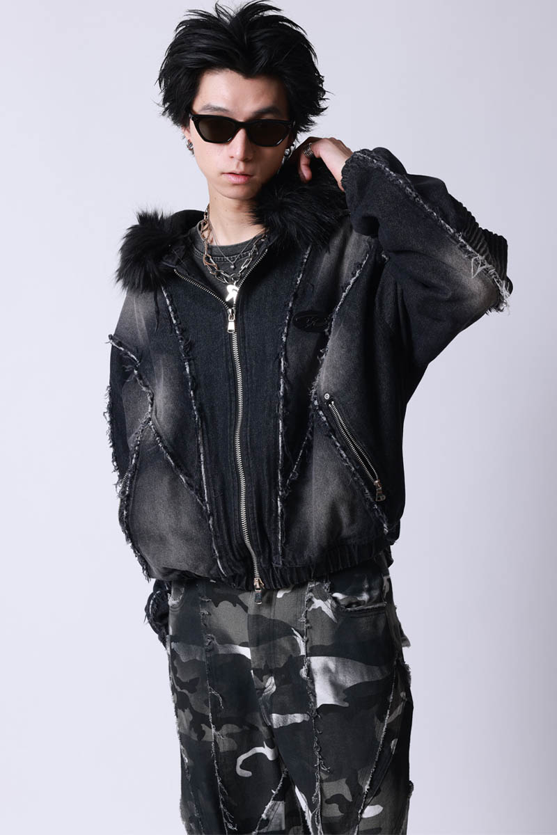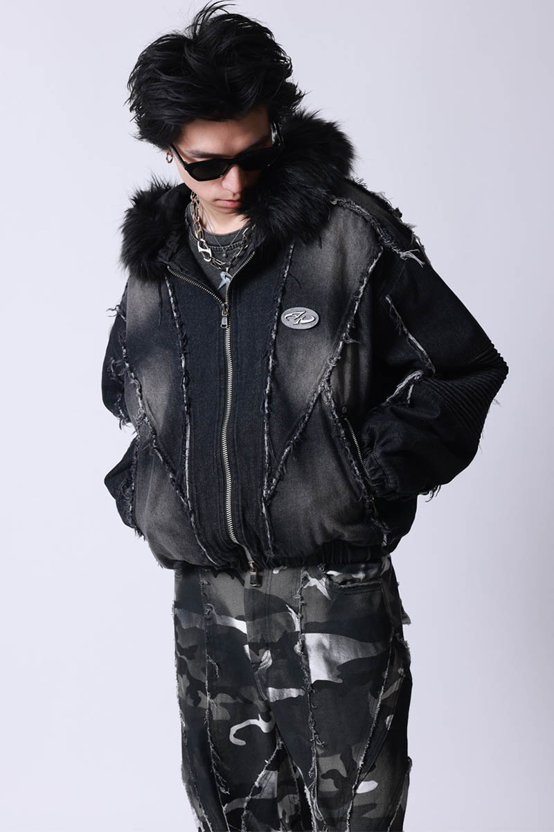 存在感抜群のダメージ・デザインと贅沢なフェイク・ファー・フードを組み合わせた、ストリート×モードを融合したジップ・アップ・ジャケットが登場。
