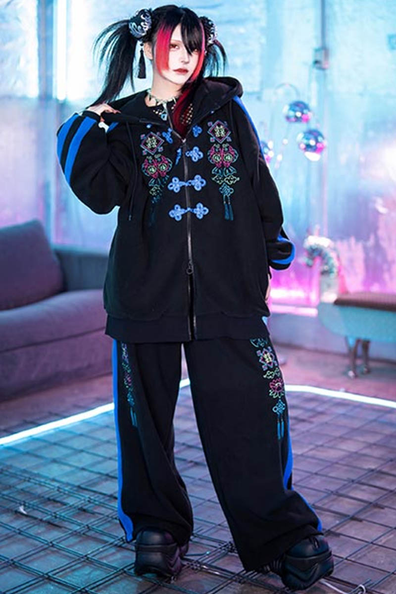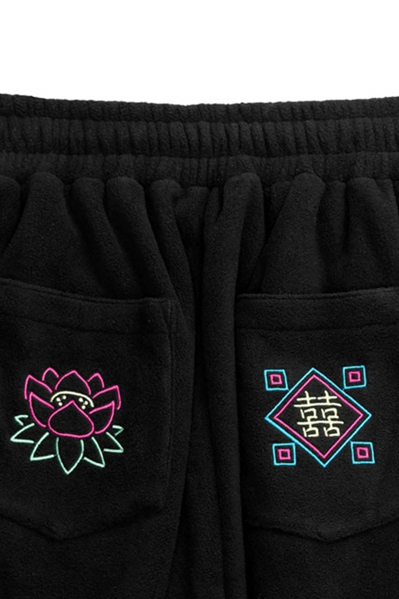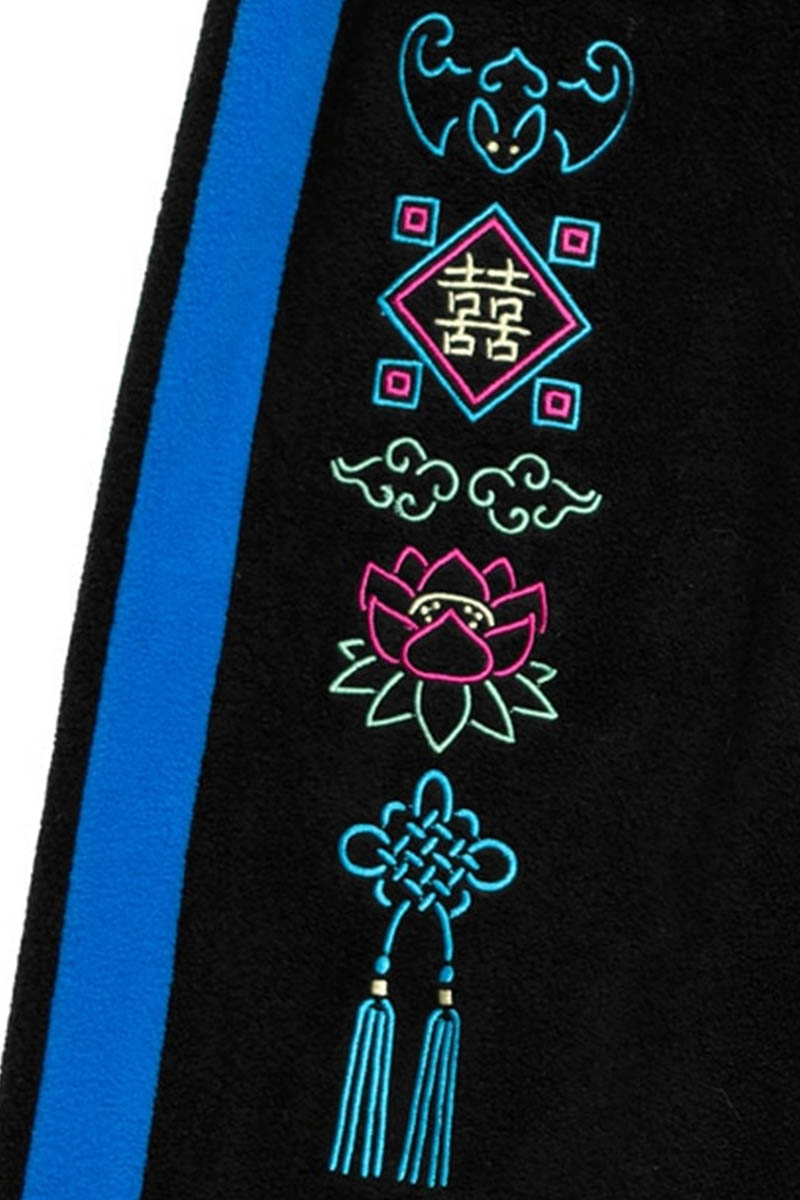 フロントと背面ポケットに豪華なチャイナ刺繍、目を引くカラーリングの極太のサイドラインで、異次元の可愛さに昇華したふわもこチャイナパンツ!