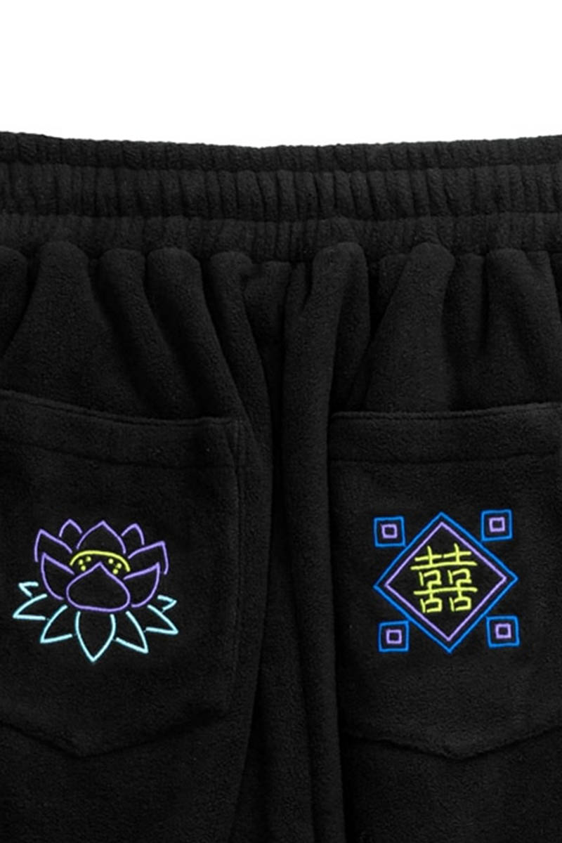 フロントと背面ポケットに豪華なチャイナ刺繍、目を引くカラーリングの極太のサイドラインで、異次元の可愛さに昇華したふわもこチャイナパンツ!