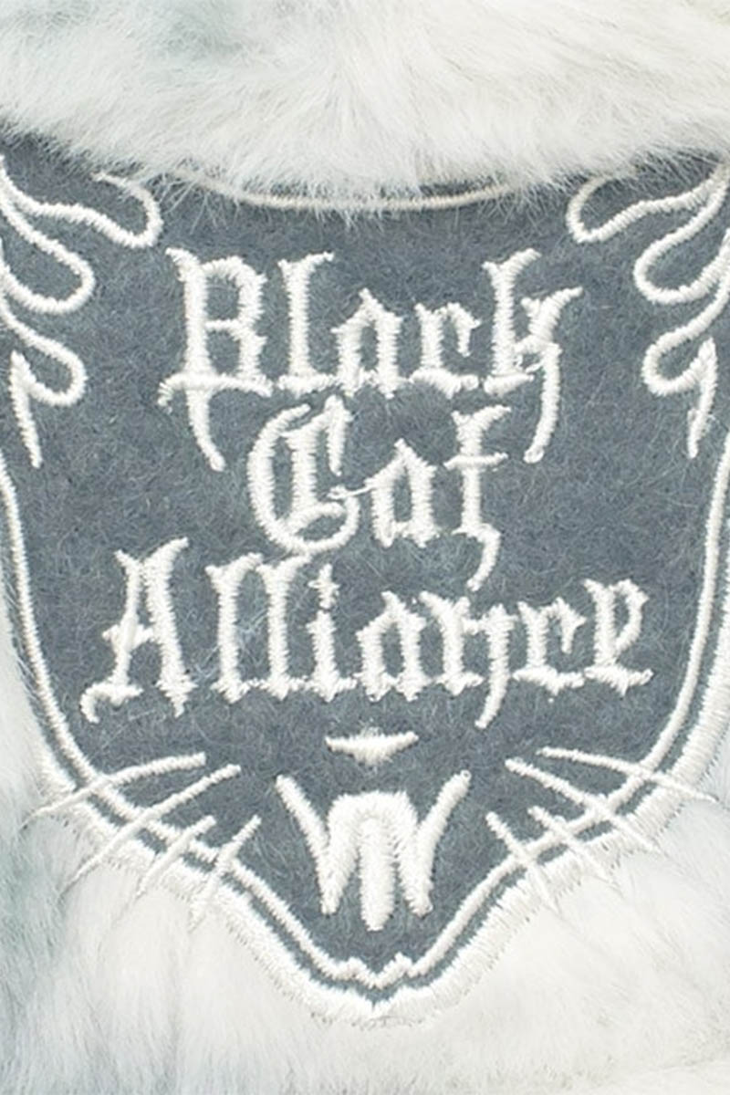 ふわふわのフェイクファーにエンブレムのような黒猫刺繍をあしらった、シーズンムードを高めてくれるファーバケハが登場