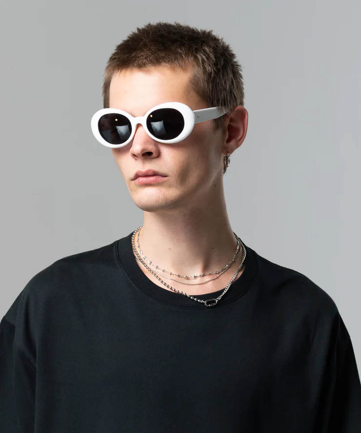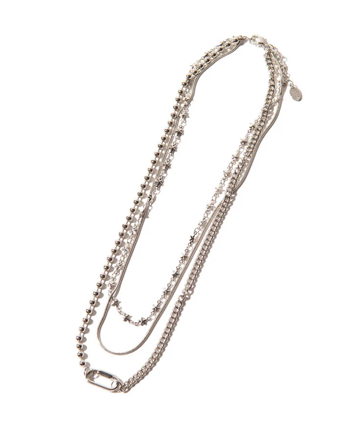それぞれデザインの異なる3種のネックレスを連ねたTriple Layer Necklace。スターモチーフを繋いだチェーンはフロントのスクリューカラビナがアクセント。さらにボールチェーンとスネークチェーンをセットにしており、重ね付けすれば無骨さと繊細さが同居するエッジィなムードを演出します。