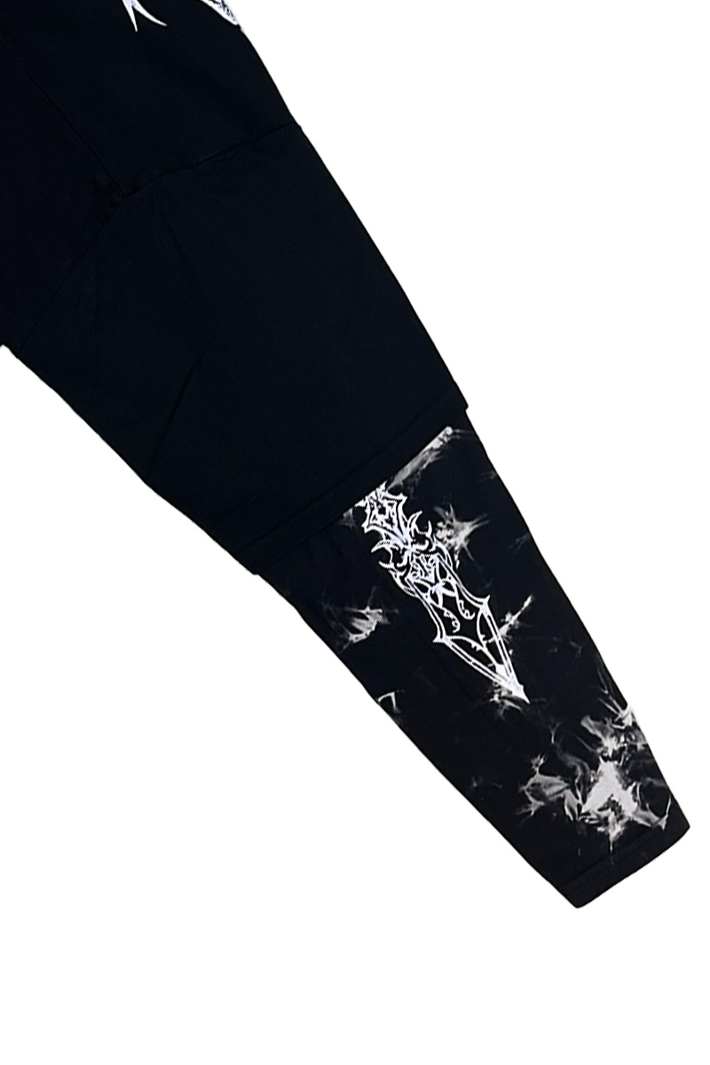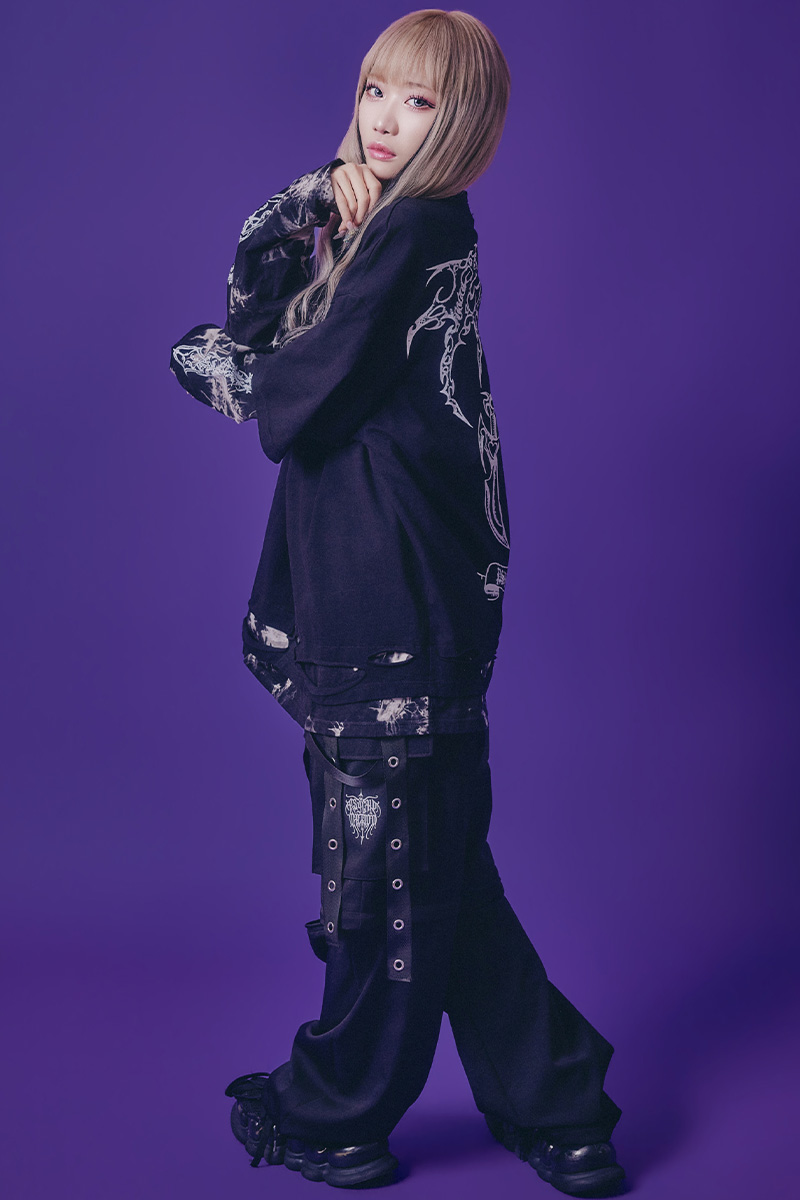 バックには、翼と剣とクロス・モチーフを融合させたゴシック調の大型プリントを大胆に配置し、圧倒的なインパクトを放ちます。