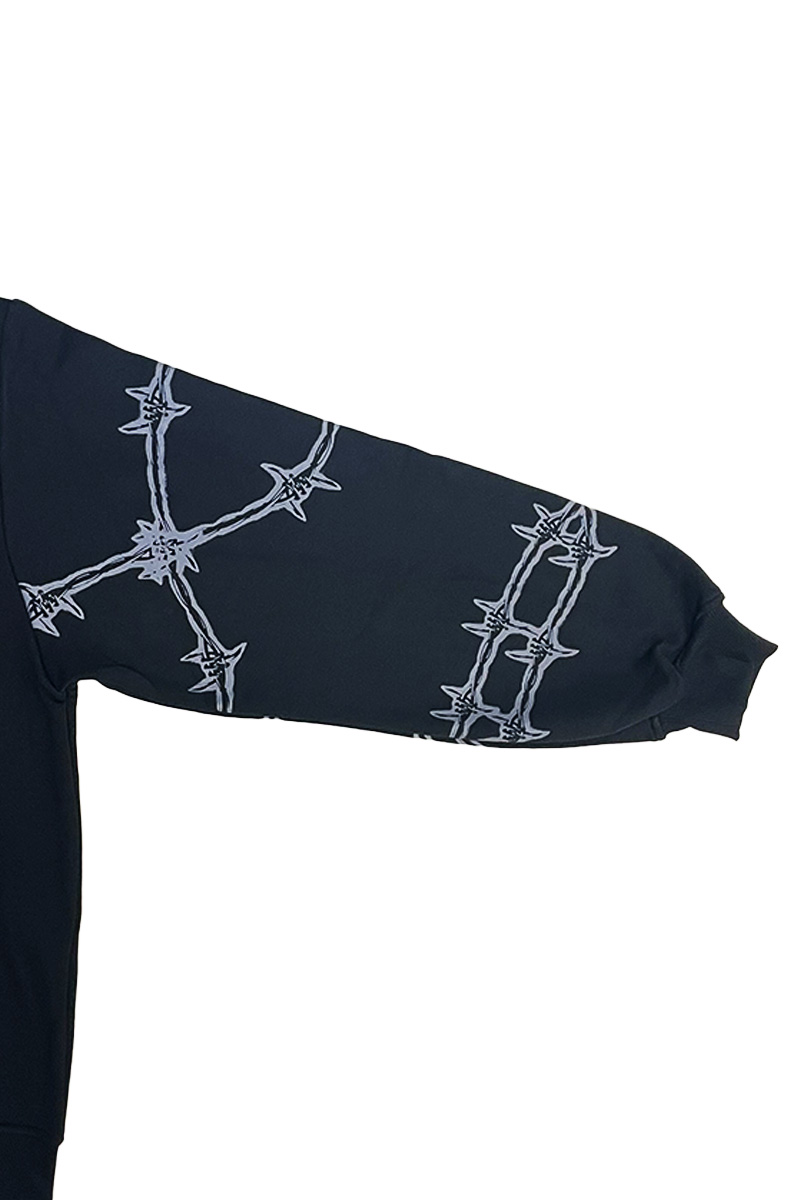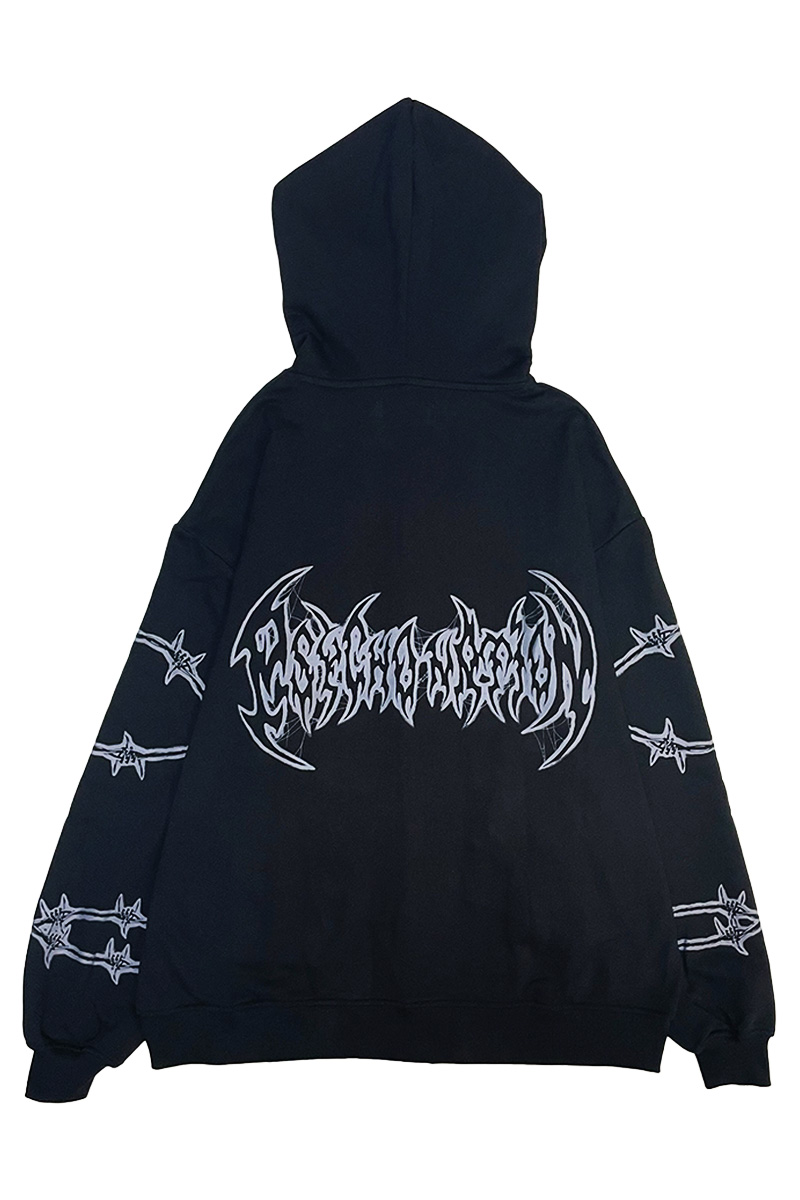 エッジの効いたバーブド・ワイヤー・モチーフと、存在感抜群のロゴ・デザインが目を惹くジップ・アップ・フーディーが登場。