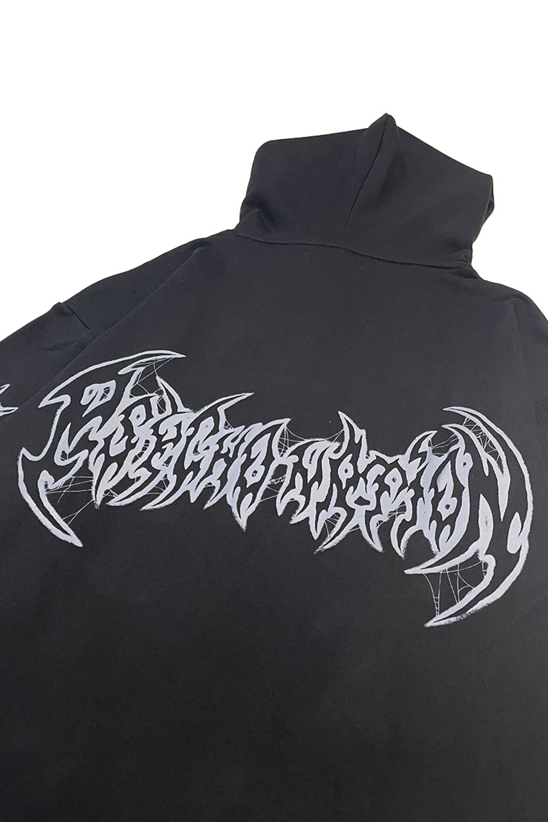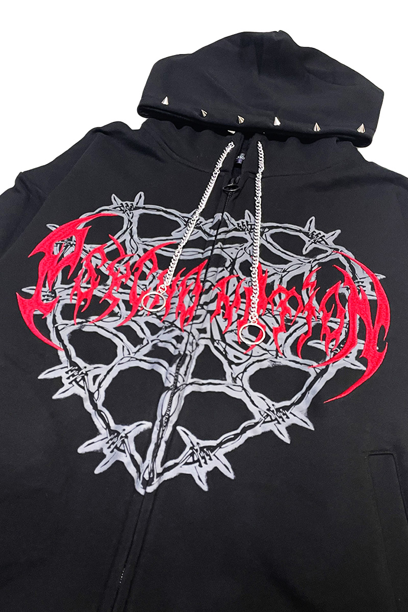 フード部分にはスタッズをあしらい、チェーン付きジップがダークで攻撃的な世界観を演出します。