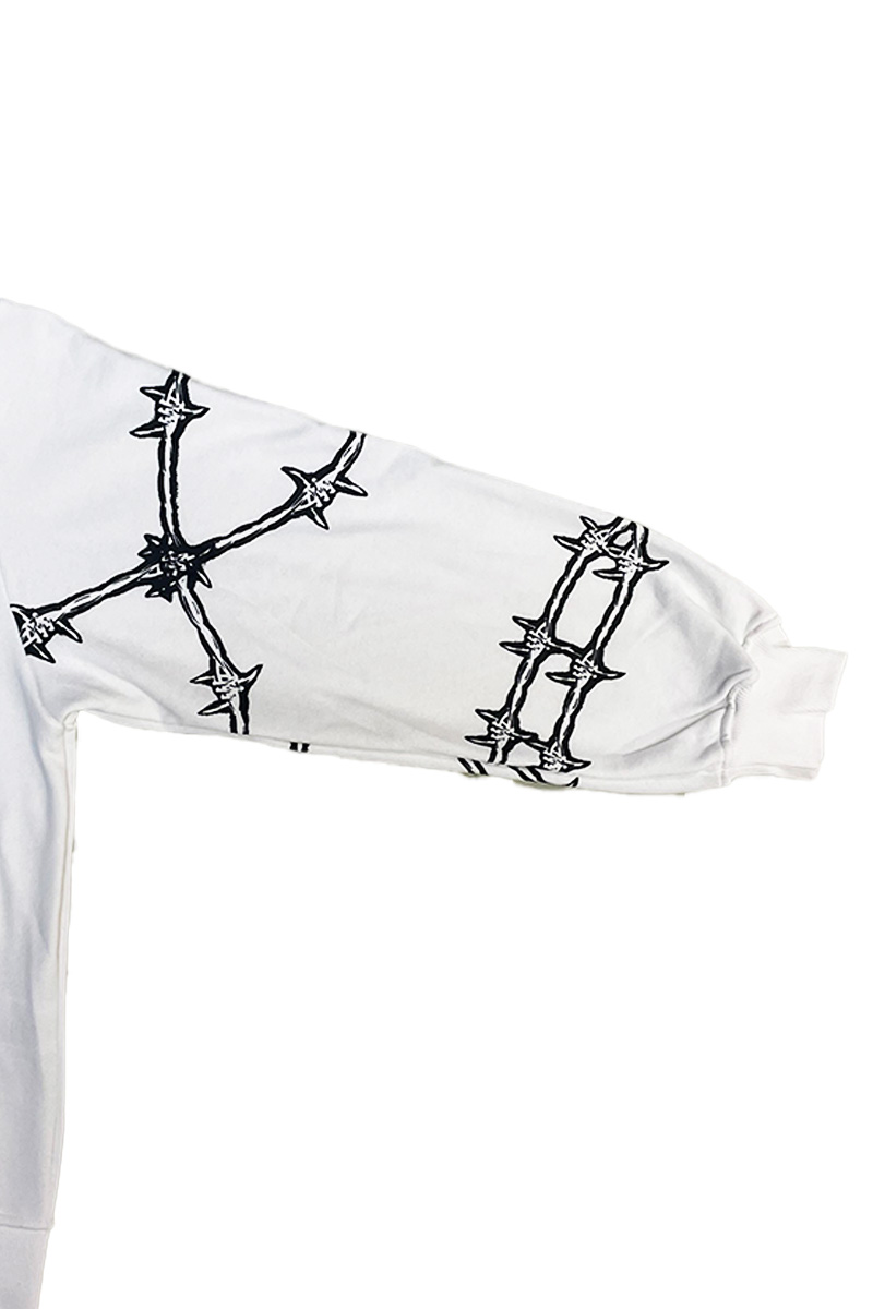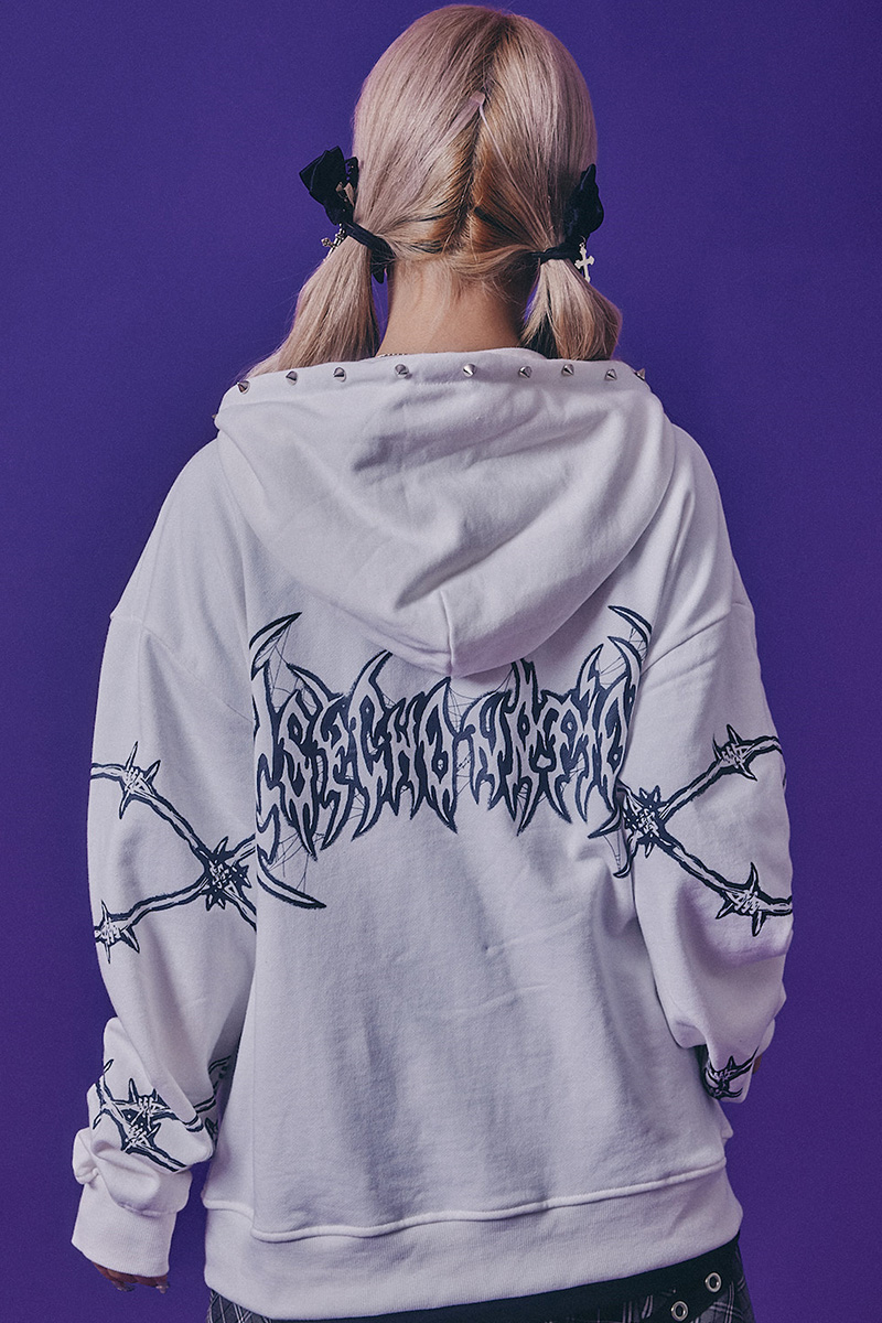 エッジの効いたバーブド・ワイヤー・モチーフと、存在感抜群のロゴ・デザインが目を惹くジップ・アップ・フーディーが登場。