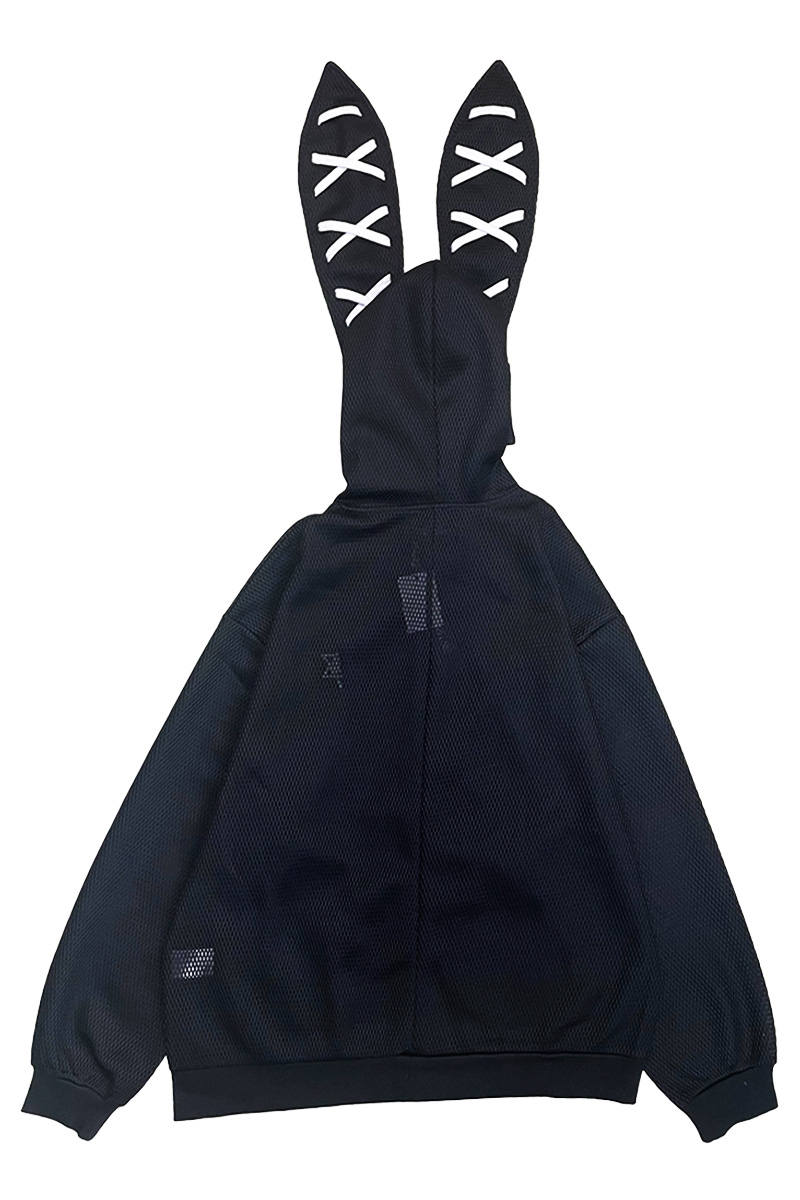 フード部分にはバツ・ステッチ風デザインを施した立体的なウサギ耳を配置し、ダークで病み感のある世界観を表現しています。