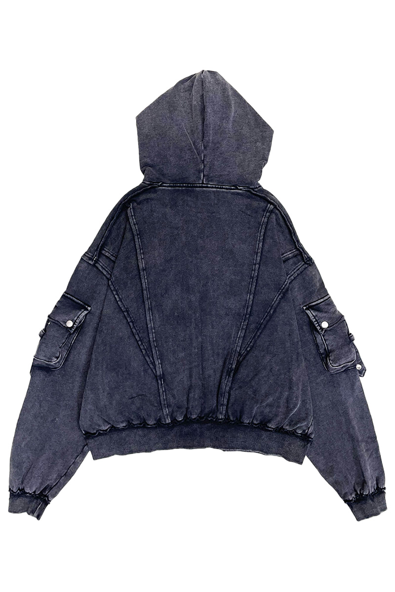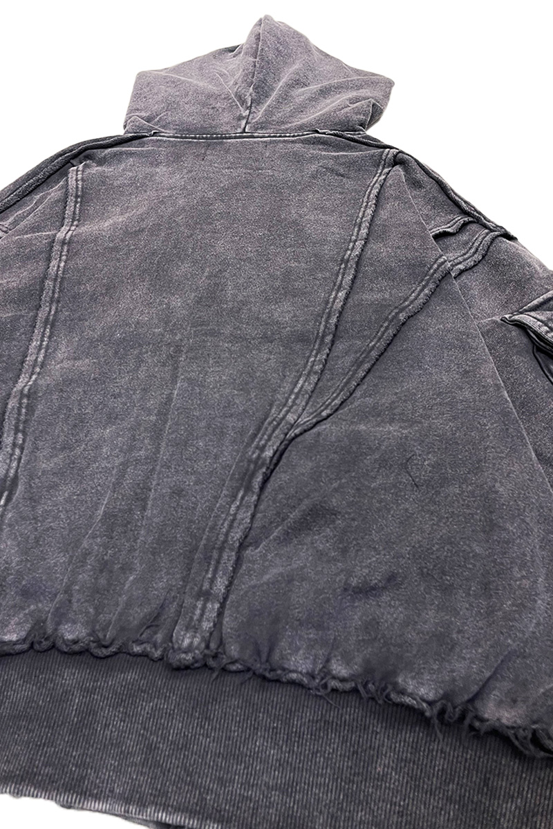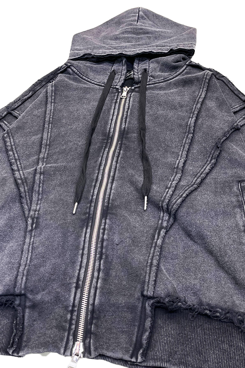 立体的な切り替えデザインと、退廃的なヴィンテージ・ウォッシュ加工が印象的なジップ・アップ・フーディが登場。