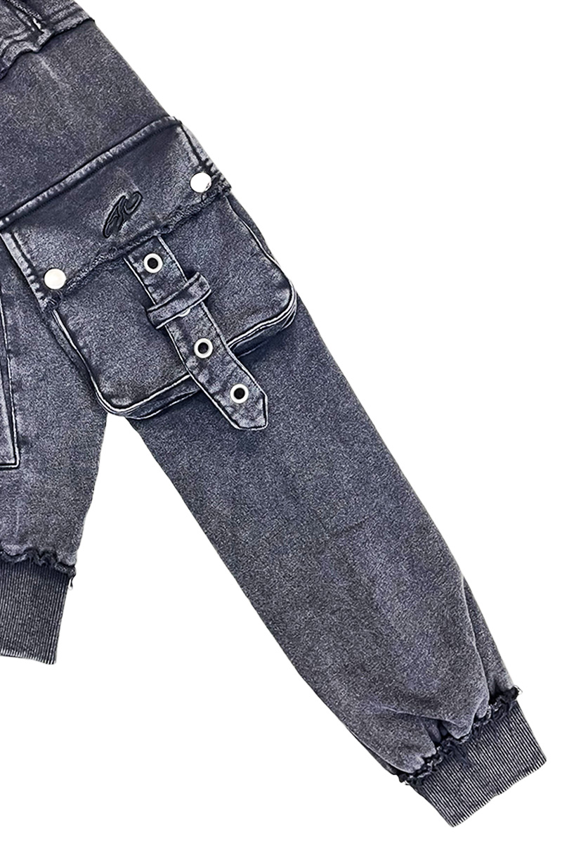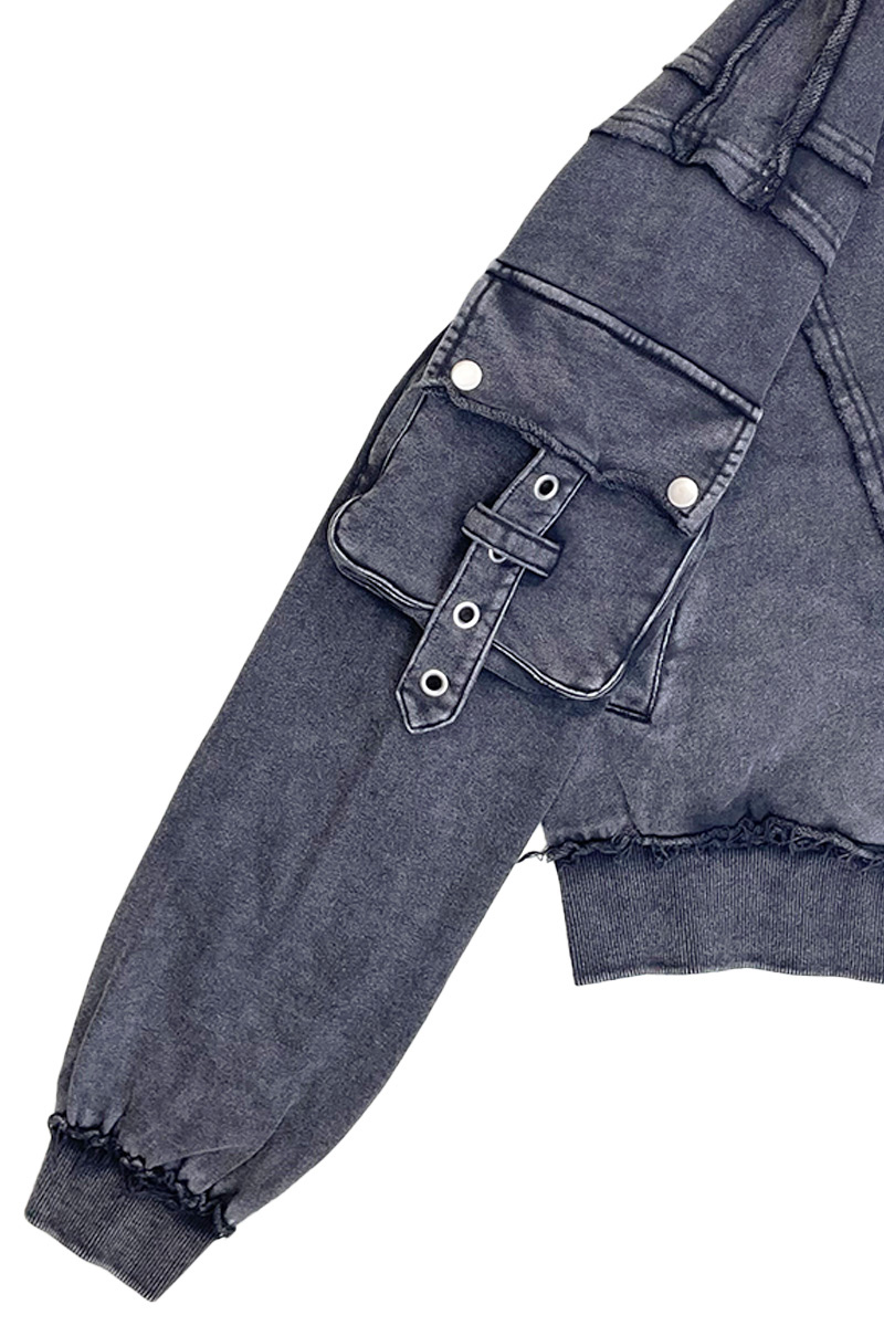 アーム部分にはフラップ・ポケットとベルト・ディテールを配置し、ミリタリー要素とストリート感を融合させたデザインです。