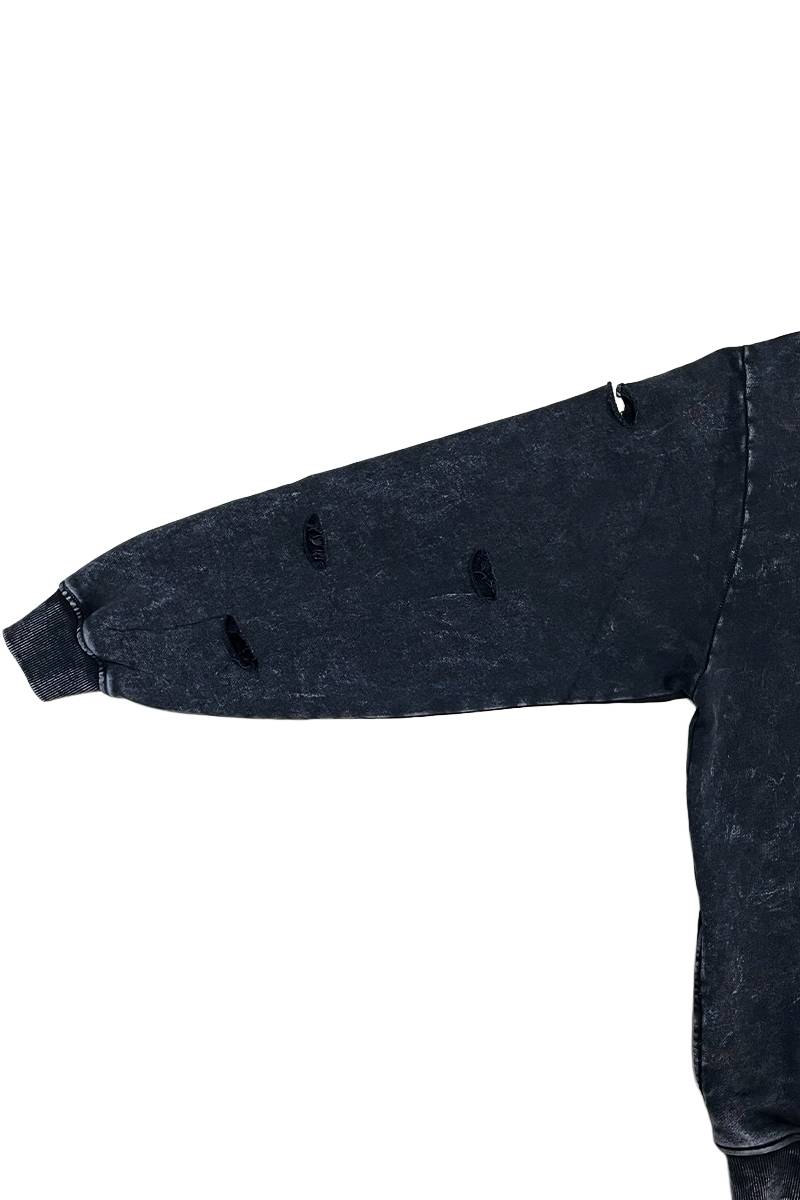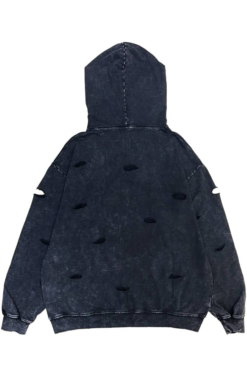 重厚感のあるグラフィックとダメージ加工を組み合わせた、存在感抜群のプルオーバー・パーカー。