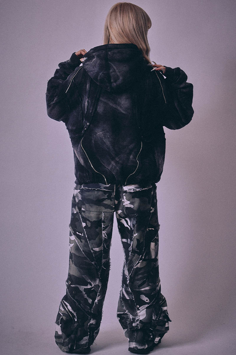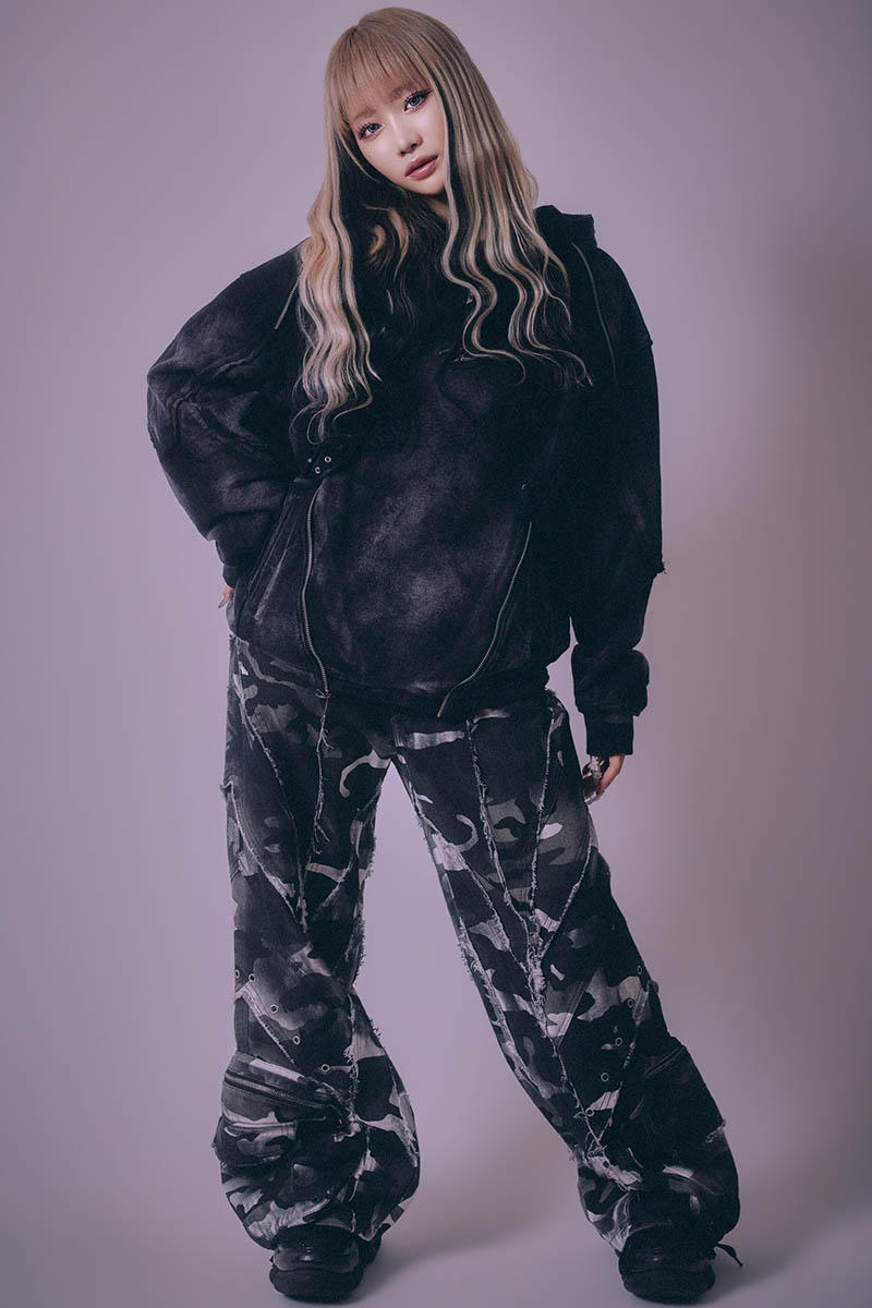 さらに、ハードなアシッド・ウォッシュ加工を施すことで、長年使い込まれたような奥行きのあるムラ感と、重厚な質感を表現。ストリートの枠を超え、アート・ピースのような佇まいを感じさせる一着です。