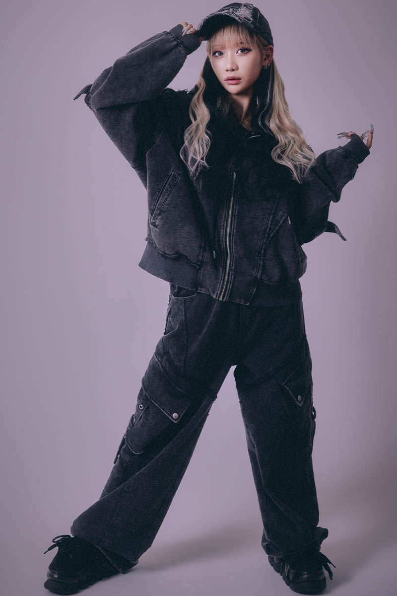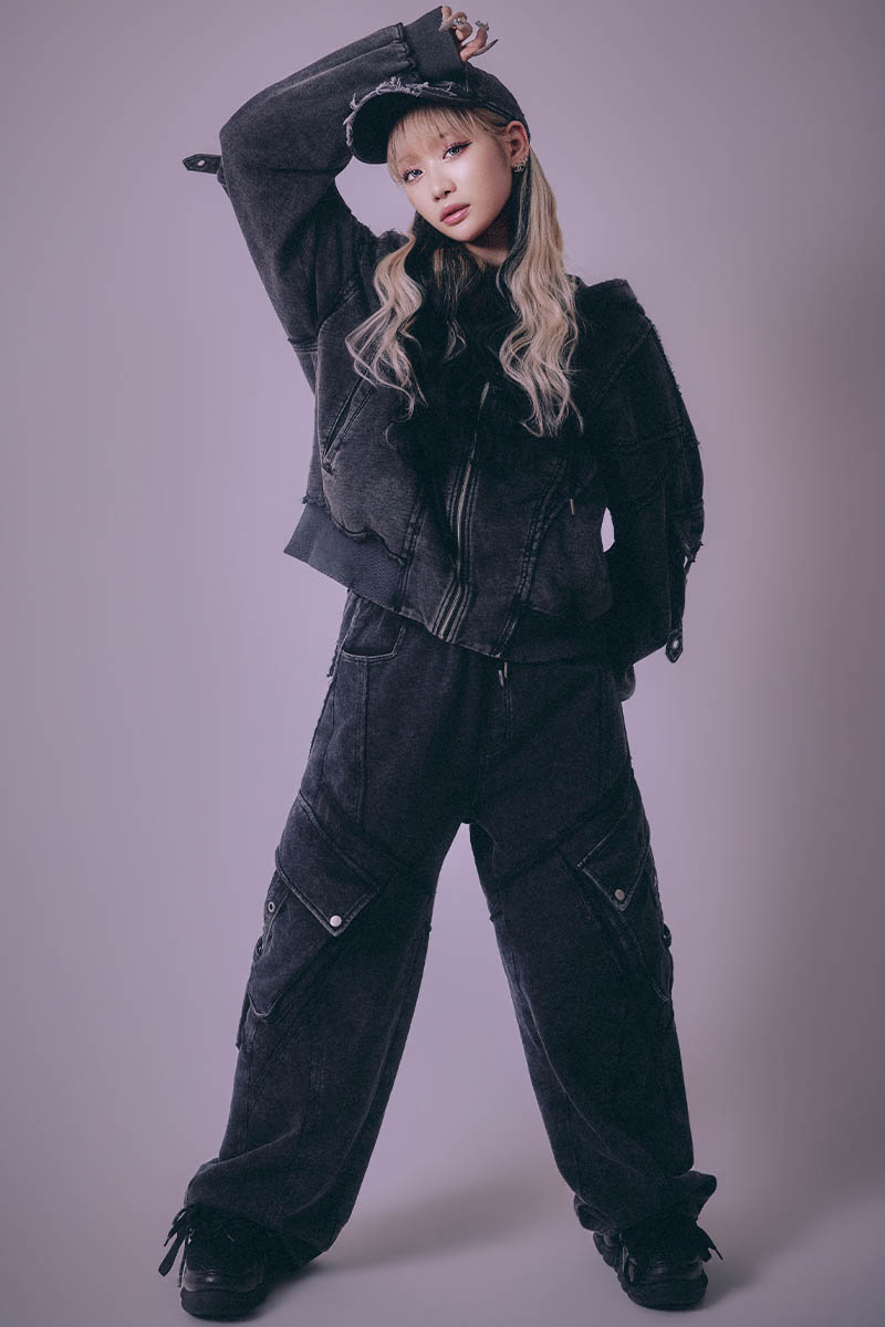 フロントからサイド、バックにかけて複雑に走るステッチ・ラインが、視覚的なインパクトとともに脚のラインを立体的に演出。 ストリート・シーンにおいて、これ一枚でコーディネートの完成度を格段に引き上げる、こだわりの詰まったアイテムです。