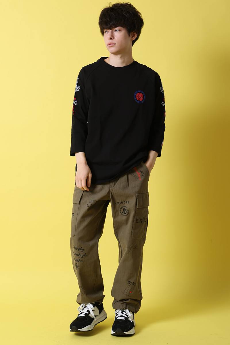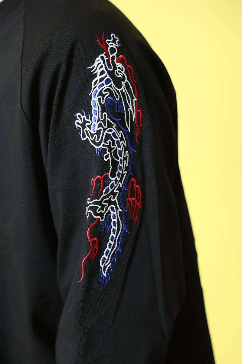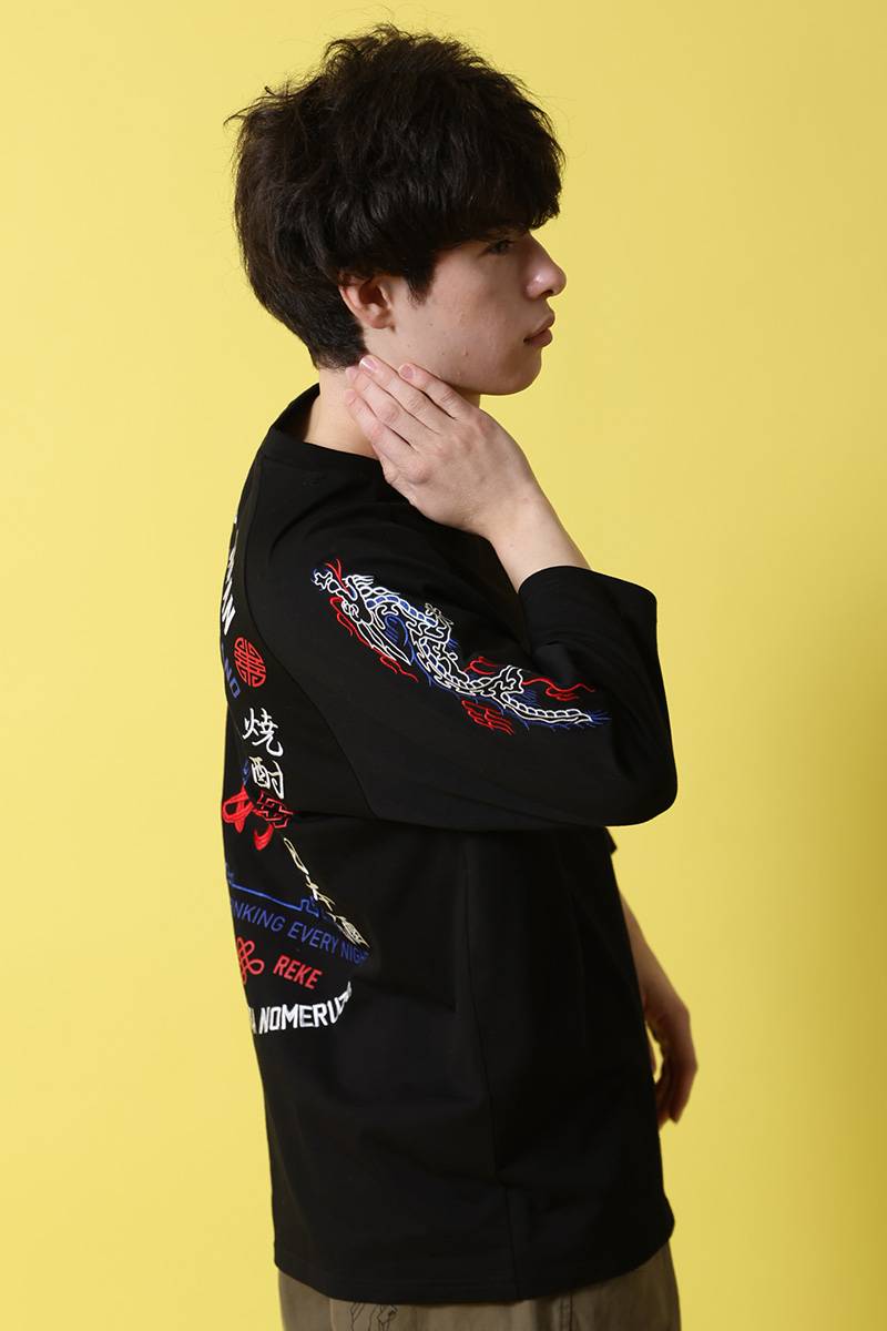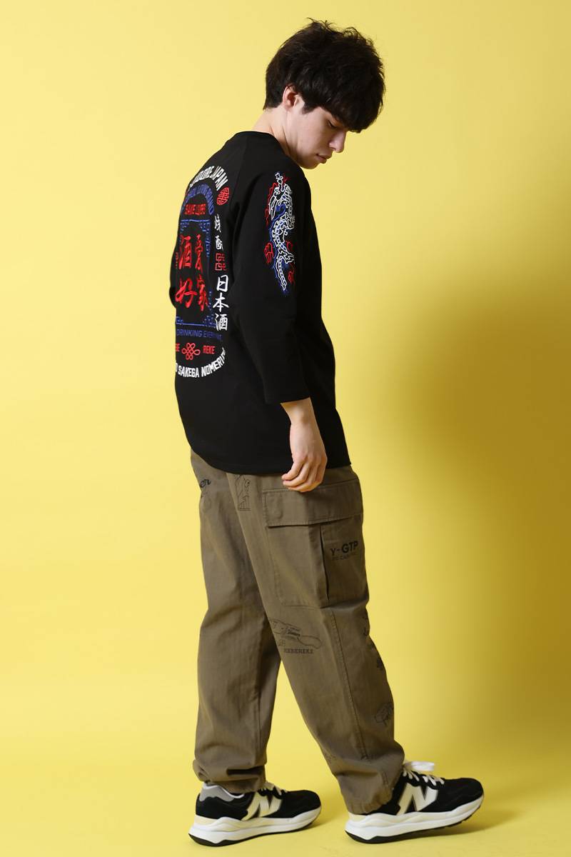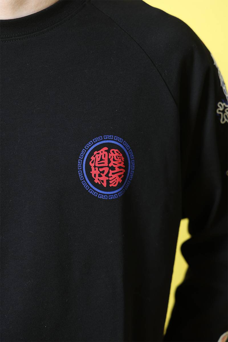バックにはブランドのアイコンでもある“酒愛好家”と中華風のグラフィックでデザイン。フロントにもワンポイントでデザインを配置しました。
