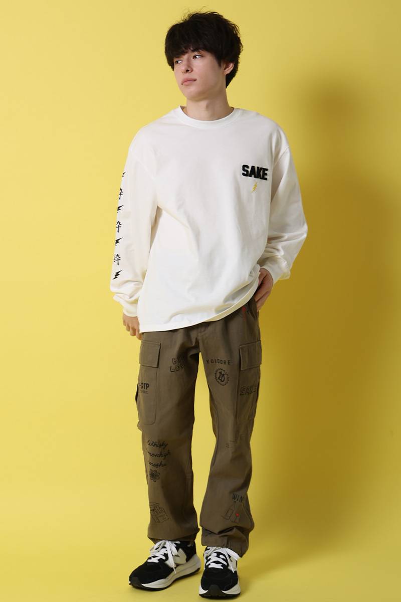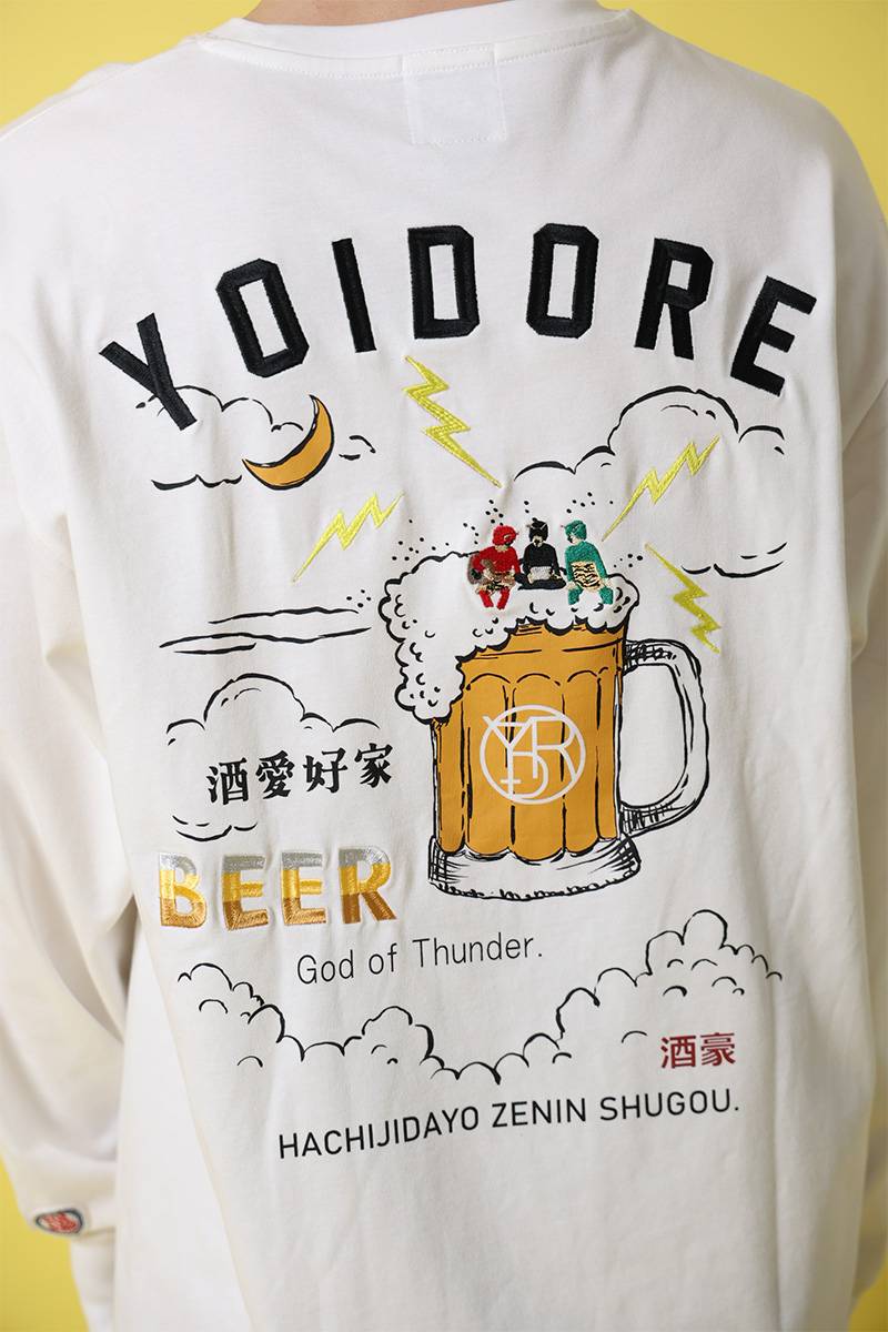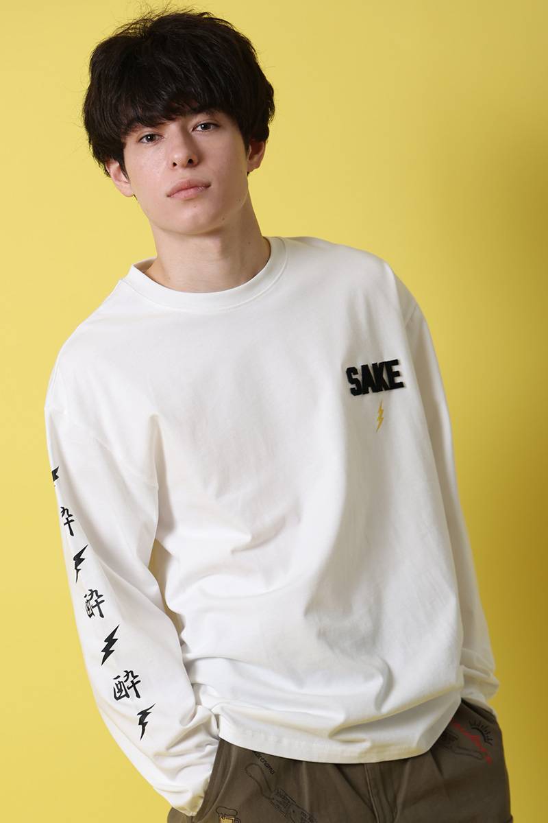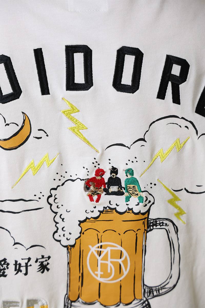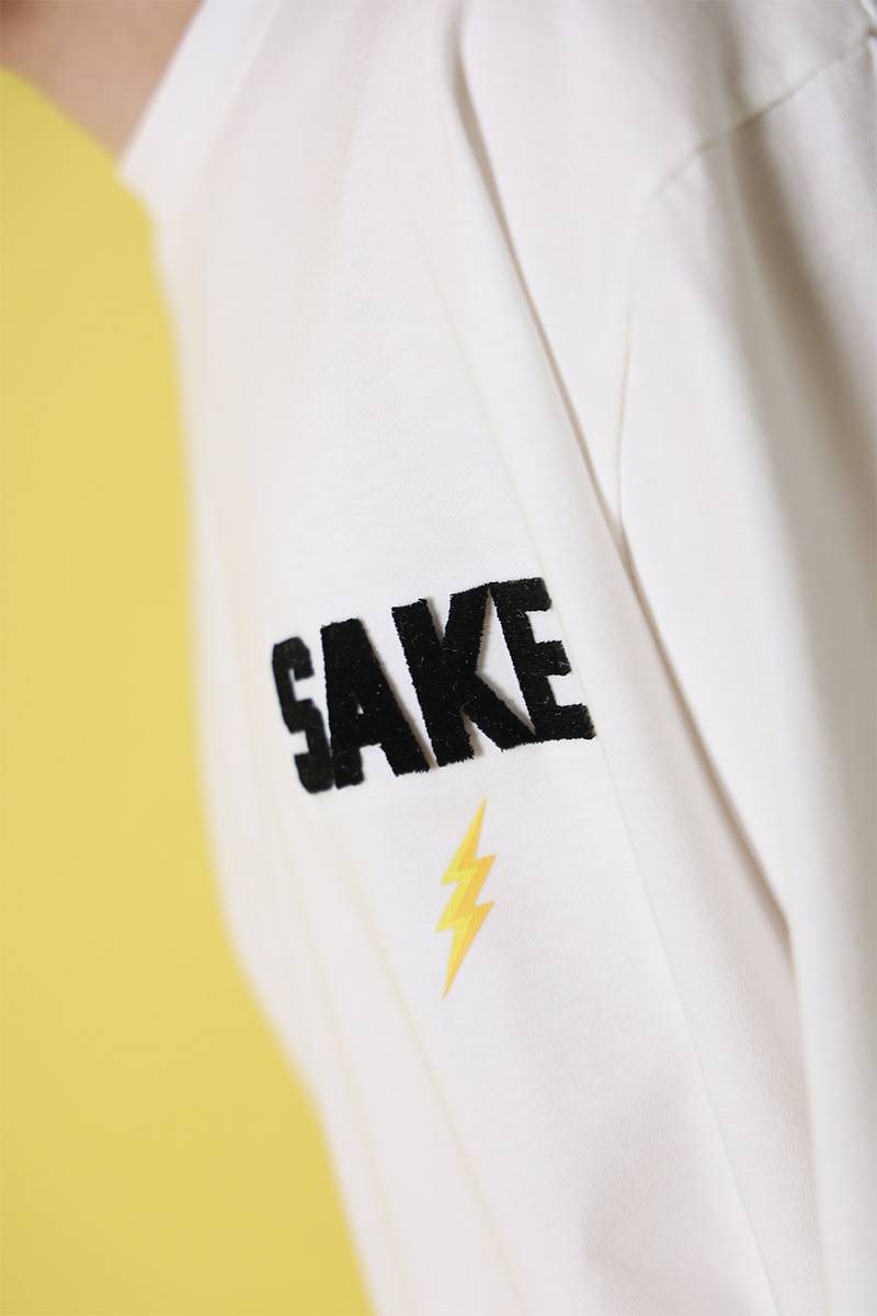 バックには、ビールの泡の上で何やら話し込んでいる雷様を刺繍でデザイン。フロントにはシンプルに雷マークと“SAKE”を配置。袖にもデザインを配置しポップなアイテムに仕上げました。