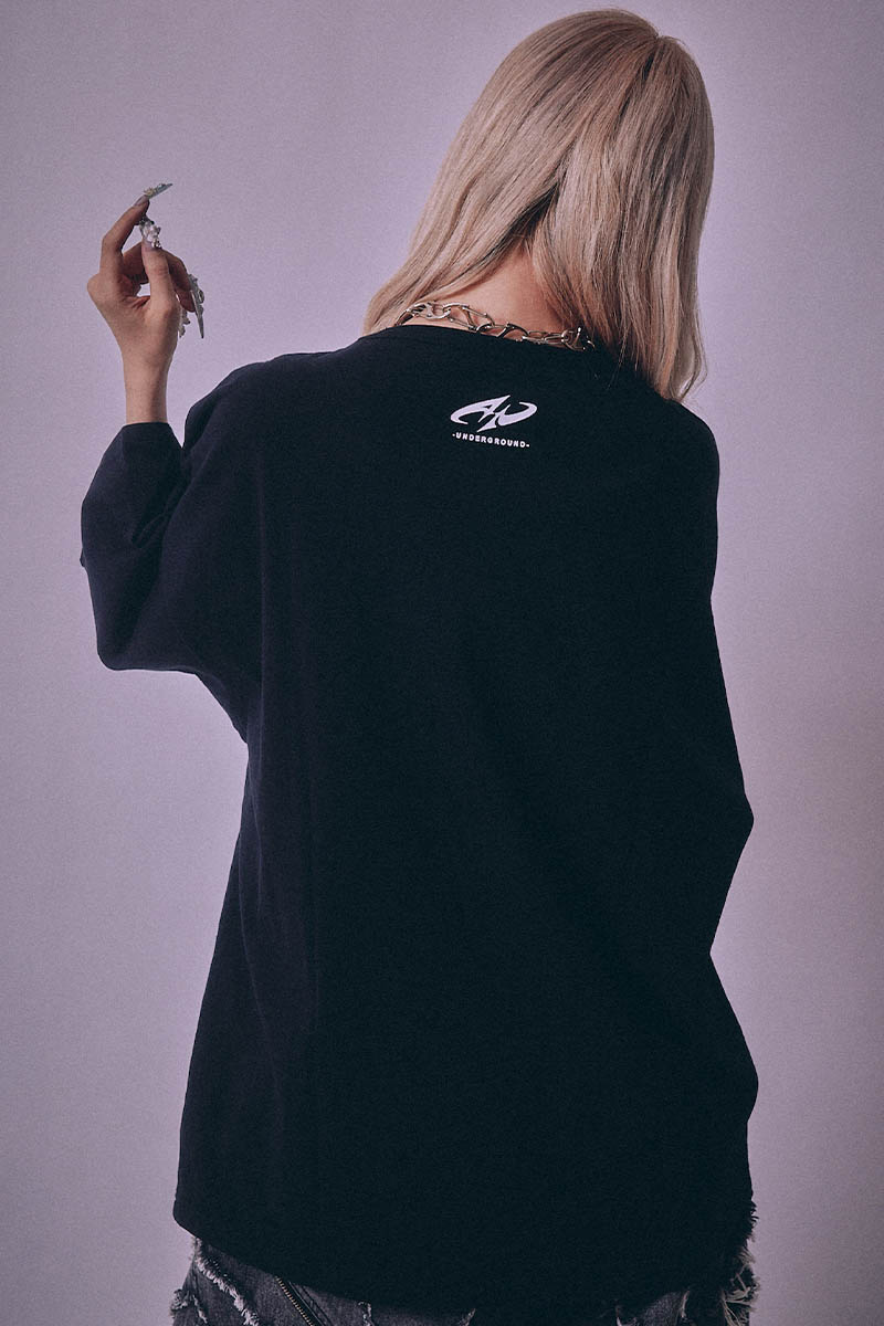 フロントには躍動感あふれるキャラクター・プリントと、ゴシック調ロゴを大胆に配置し、存在感抜群のデザインに仕上げました。