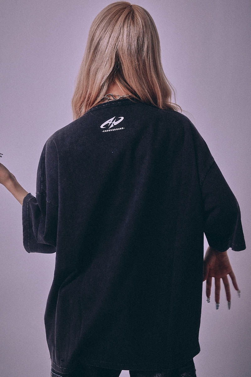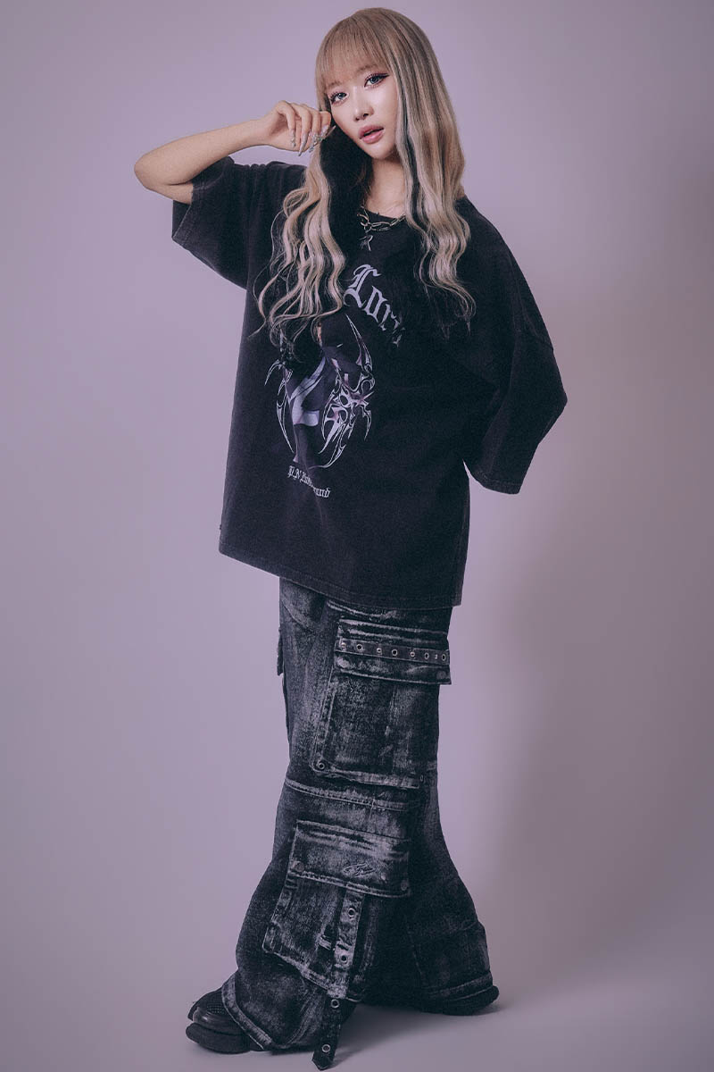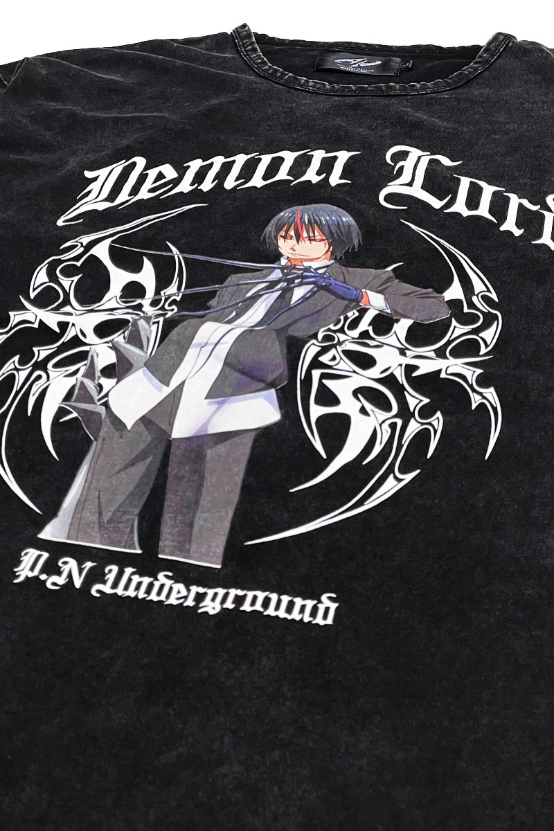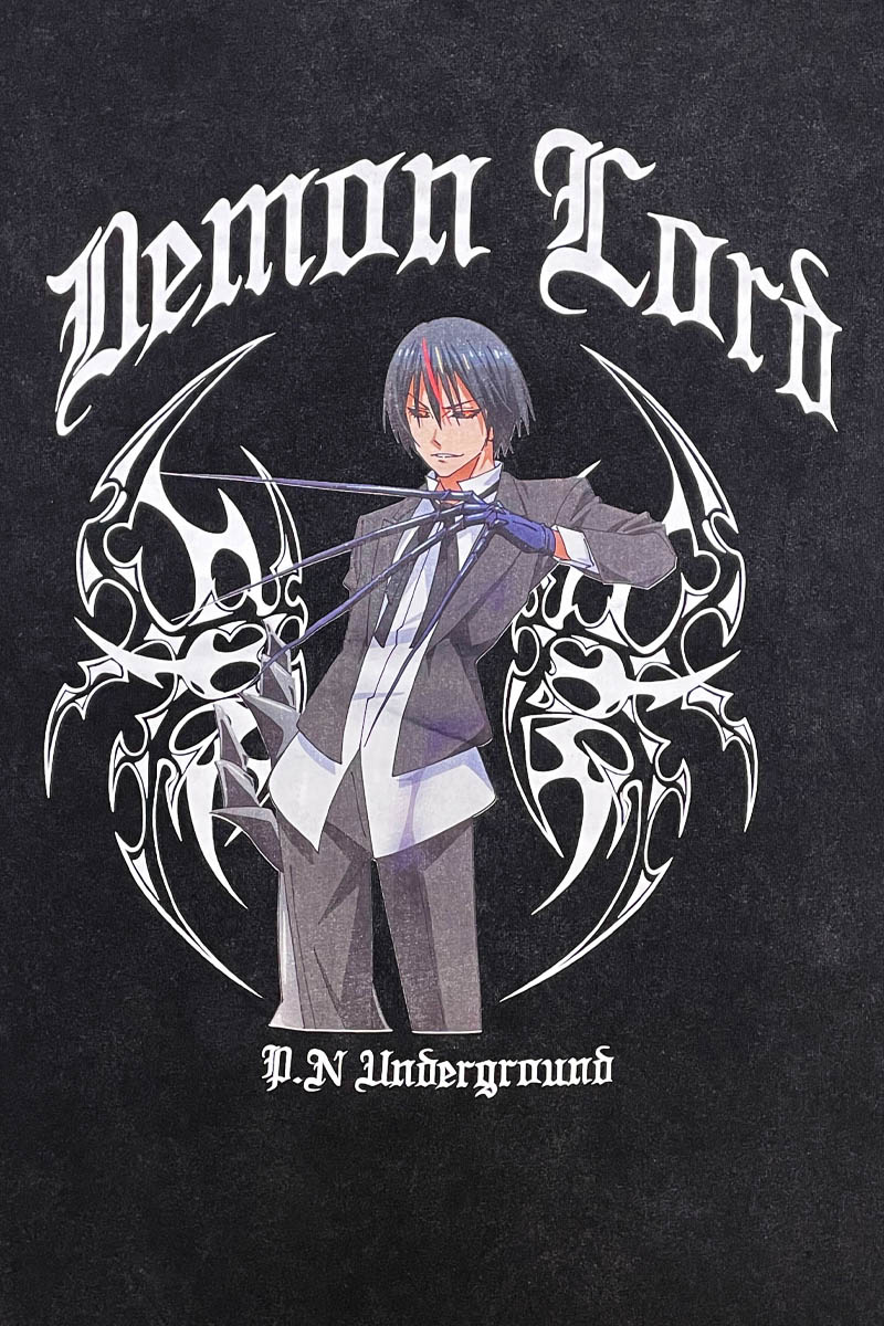 フロントには"Demon Lord"のロゴと、鋭さのあるモチーフを背景にしたキャラクター・プリントを大胆に配置し、圧倒的な存在感を放つ一枚に仕上げました。