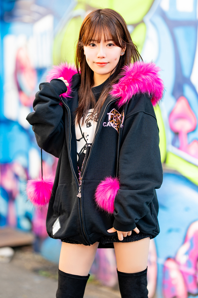 ファー付きフードや、フードから垂れるファーボンボンがギャルムードをさらに加速。