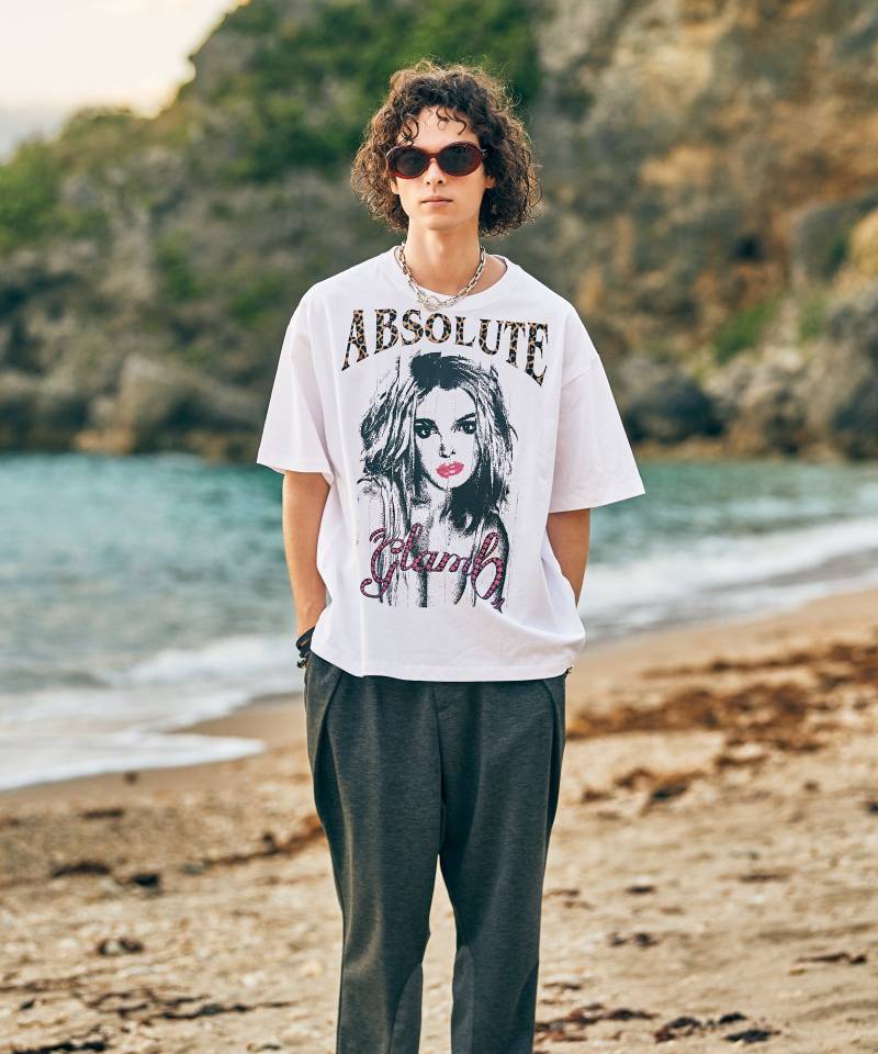 聴く者を圧倒するカリスマティックなアーティスト像をグラフィックに描き出すDiva T-Shirt。フロントにシュレッダーにかけたような効果を持たせて配したのは歌姫のポートレート。モノトーンの色使いでシンボリックに描きながら、唇とglambロゴのスターモチーフにはラメプリントを、