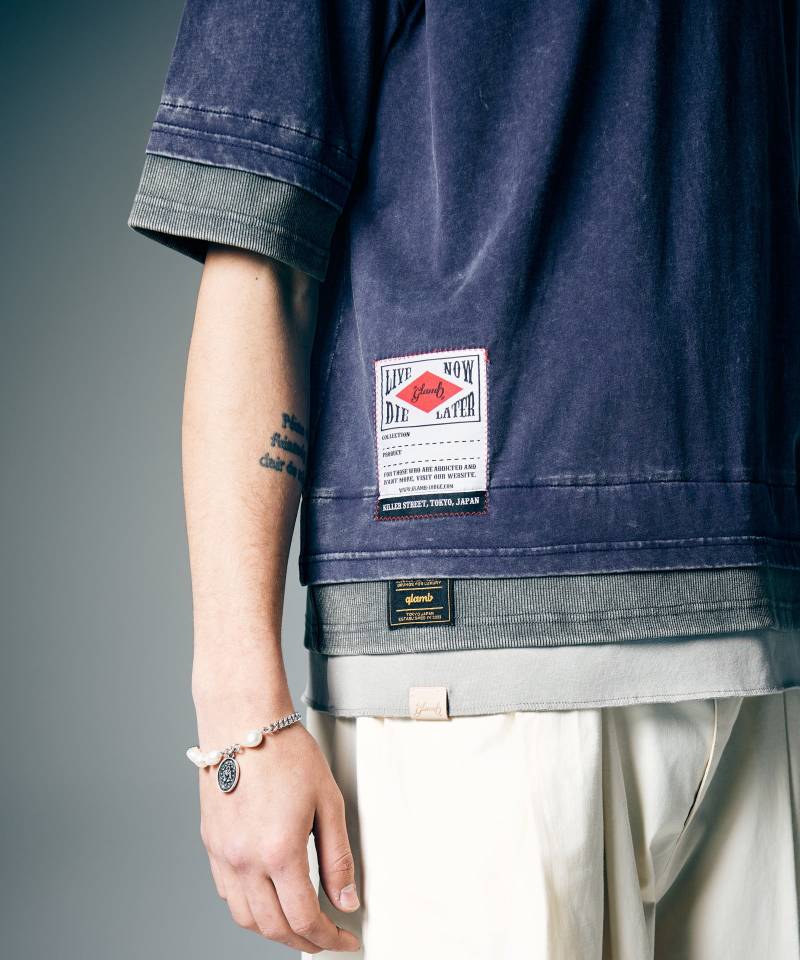 glambのアーカイブの一つであるトリプルレイヤーTシャツ、Tri Layered Cutsewが今季再登場。1枚で重ね着スタイルを表現するのは天竺とリブを使い分けた袖と裾のフェイクレイヤード。裾には今季新たに登場となるスペックタグ、glambのオーセンティックなブランドタグ、シューズラインに見られるヌメ革タグを連ねてレイヤードを強調しました。ビッグシルエットのボディはパウダー加工で経年変化の表情に。こなれた空気感が3種の生地を違和感のないミックスにまとめました。