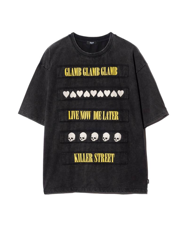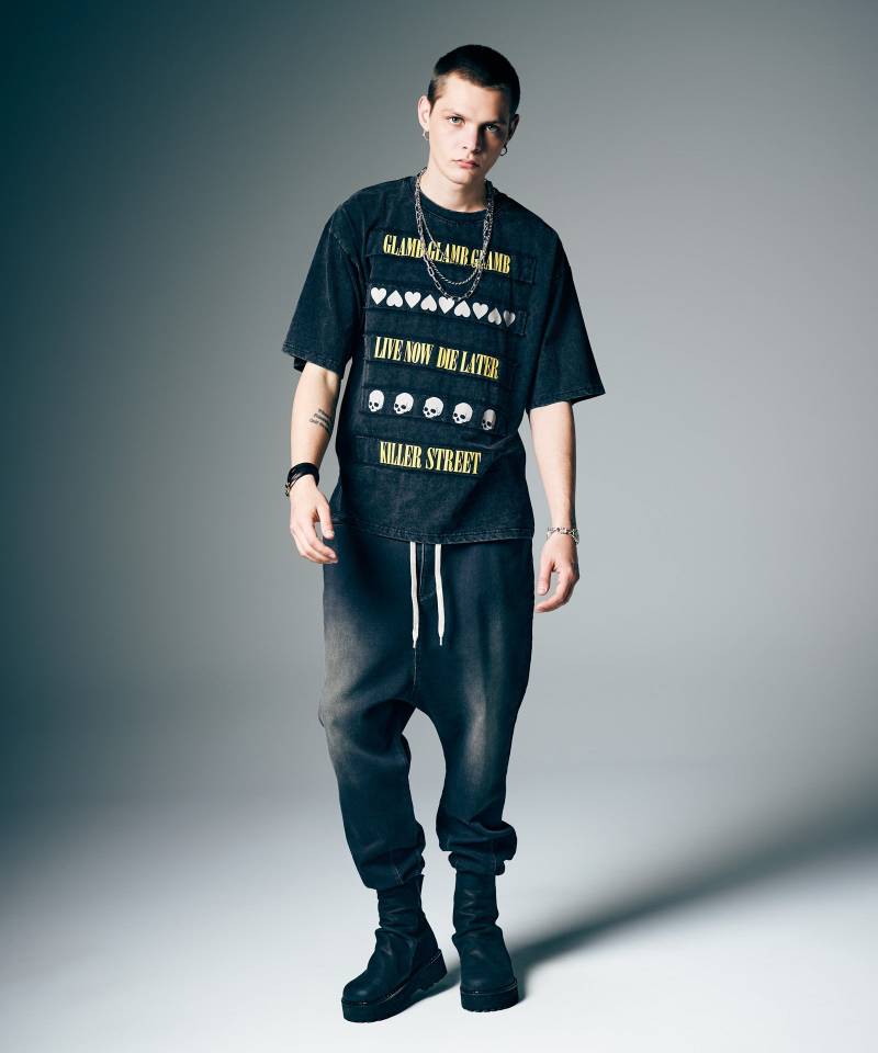 glambのブランドコンセプトとなるグランジを彷彿とさせるモチーフをグラフィカルなレイアウトで敷き詰めたSkull Heart T-Shirt。別生地で用意したボーダーパーツを身生地に縫いつけて表現した柄使いは洗いの工程を通すことで縁のダメージも演出。仕上げにパウダー加工を施してヴィンテージライクな表情に仕上げています。テキスタイルに用いたのはコットン100%のミディアムウェイト生地。ドロップショルダーに広めの身幅を掛け合わせたビッグシルエットがグランジらしいルーズなスタイリングをもたらします。