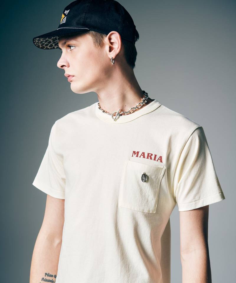 ポケットTシャツにアクセサリー的な意匠をあしらって博愛のメッセージを込めたMaria Charm T-Shirt。フロントポケットには