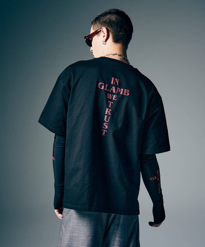 グランジロックのアートワークをglambのフィルターで再解釈したGrunge Mother T-Shirt。天使の翼やハート柄の箱、聖母像を掛け合わせたフロントプリントはブラー効果を加えてグラフィカルなヴィジュアルに。バックスタイルにはアメリカ合衆国の標語にパロディを加えたロゴを配しました。ビッグシルエットのボディにはミディアムウェイトながらタフな質感をもったコットン生地を使用し、くっきりとした輪郭に。前後差を付けた裾にはスリットを入れており、動きある抜け感を演出します。