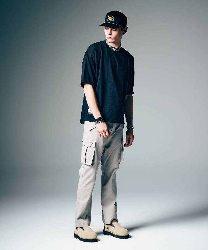 シンプルなデザイン性だからこそ国内ファクトリーで素材と工程にこだわって仕上げたQuick Dry T-Shirt。一見プレーンながら、ロールアップをステッチで留めた袖口とスリットを備えた前後差ある裾がスタイルある佇まいを演出。ミリタリータグにオールドスクールなデザインとブランドからの野心的なメッセージを乗せたスペックタグをあしらい、タフなムードを持たせました。テキスタイルに用いたのは表面にコットン、裏面に吸水速乾やUVカットなど高機能素材として知られるCOOLMAX®を用いた薄手生地。ビッグシルエットに設定しており、ボトムスを選ばず合わせていただけます。