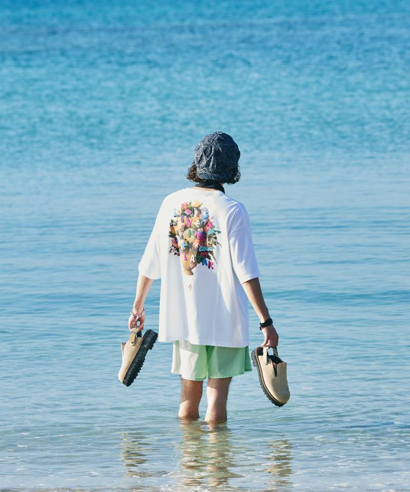 ヴァンダリズム的手法を取り入れながらカラフルなグラフィックをあしらったFlower Graffiti T-Shirt。前身頃は胸元へのワンポイントロゴのシンプルなデザインながら、ブランドのアートワークが込められたのはバックスタイル。アカデミックな静物画に、落書きを描き重ねたデザインは昨今のアートシーンに呼応する表現となっています。テキスタイルに使用したのは滑らかで肌触りの良いコットン100%のミディアムウェイト5.6オンス天竺。身幅を広めに、着丈を長めに設けたビッグシルエットはボトムスを問わずスタイルある佇まいを作り上げます。