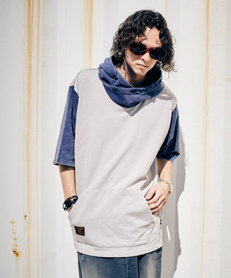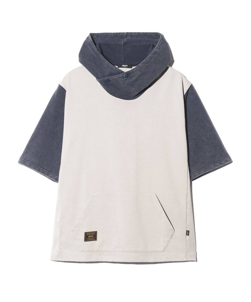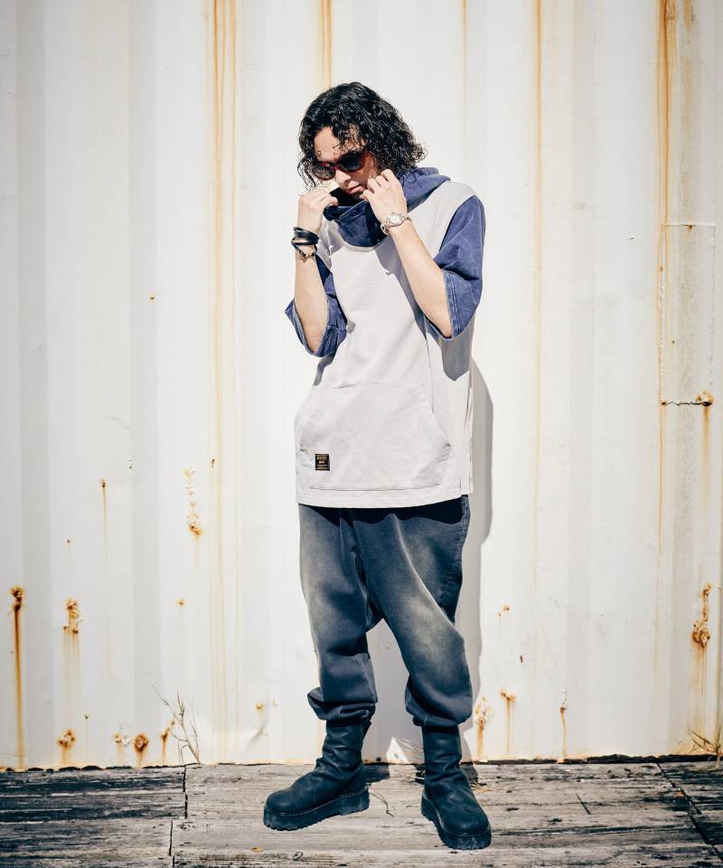 フーディを季節感捉えたショートスリーブで再構築、ストリートからリゾートシーンまで対応するAged Pile Hoodie。テキスタイルに用いたのは吸水性に優れ、柔らかな肌触りを備える薄手の裏パイル生地。2つボタンを配したドレープある首元と大振りなフードはその構築的なデザインに加えてサンガードとしても機能します。ボディサイドにパネル使いしたリブはヴィンテージスウェットのディテール。パウダー加工によるフィニッシュも経年変化の雰囲気を盛りたてます。