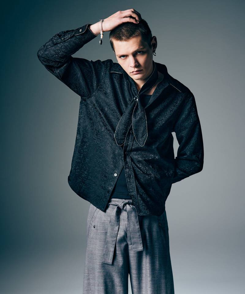 フォーマルファッションに対する煌びやかな解釈でロックマインドに溢れたシャツスタイルを提案するStuds Line Shirt。テキスタイルはWhiteには皺感あるこなれた風合いのレーヨンコットン、Black系の2色はいずれも総柄生地を使用。ゆとりある着丈と身幅を組み合わせたルーズシルエットのボディは、襟とカフスにスタッズテープを配してグラマラスなニュアンスを加えています。さらに身生地と同生地、同テープを配したスカーフをリングとともに付属。ブランドの美学を反映したトップススタイリングがこちら1枚で完成します。