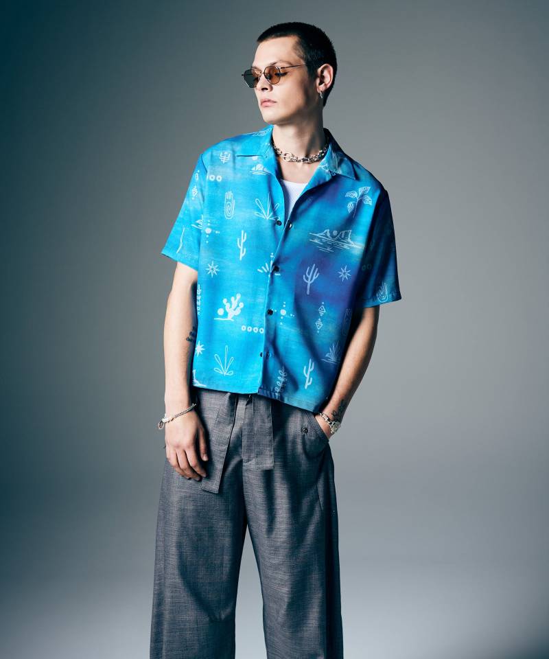 ハワイアン柄を夢見心地でシュールな世界観へと再描写したAbstract Hawaiian Shirt。プリミティブなタッチで散りばめられたのは植物や丘などアメリカの荒野を思わせるモチーフの数々。身生地は淡いグラデーションを施して、抽象的な世界観の総柄へとまとめました。ボディは身幅と着丈にゆとりを持たせたオーバーサイズシルエット。ストリートフレンドリーなサイジングと詩的な柄使いの組み合わせにより、リゾートスタイルからタウンユースまで幅広いシーンでご着用いただけるでしょう。