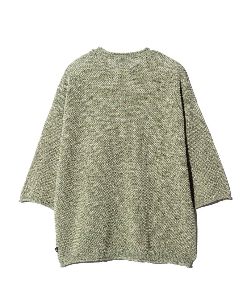 ニット素材が夏のシンプルスタイルをテクスチャ豊かにまとめ上げるLinen Mix Pullover Knit。ワイドな身幅にドロップショルダーと六分袖を組み合わせたボディは抜け感ある佇まい。そこへシャリ感と清涼感を備えたリネン混素材を落とし込むことで季節感捉えた佇まいにまとめました。編地はメッシュ編みをベースにしながら透かしは抑えることで凹凸ある表面効果を演出。首回りや裾、袖口は端にカーリング始末を施すことでカットオフしたかのニュアンスを与えており、プレーンに見せながらブランドのこだわりが随所に詰まった仕上がりとなっています。