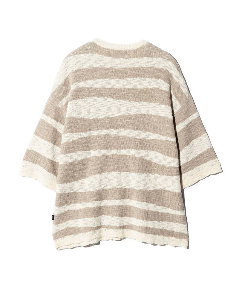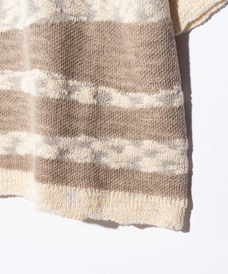 グランジファッションの代名詞であるボーダーニットをアイデア溢れるニッティングで夏のストリートに提案するRandom Border Summer Knit。ドロップショルダーと六分袖を組み合わせたルーズシルエットのボディは、太さに不規則なムラを持ったスラブ糸をアクセントに構成。身頃をランダムに走るボーダーには透け感を、首元や袖のリブには歪んだ輪郭を演出します。編み技法は生地の表と裏に異なる糸を表出させることのできるダブルジャガードを使用。スラブ糸のみでは身生地に透けが出てしまいますが、本作は裏面にストレートな糸を用いてそれを防止するなど技術に根差した配慮を施しています。
