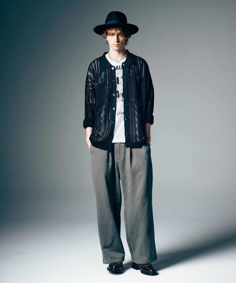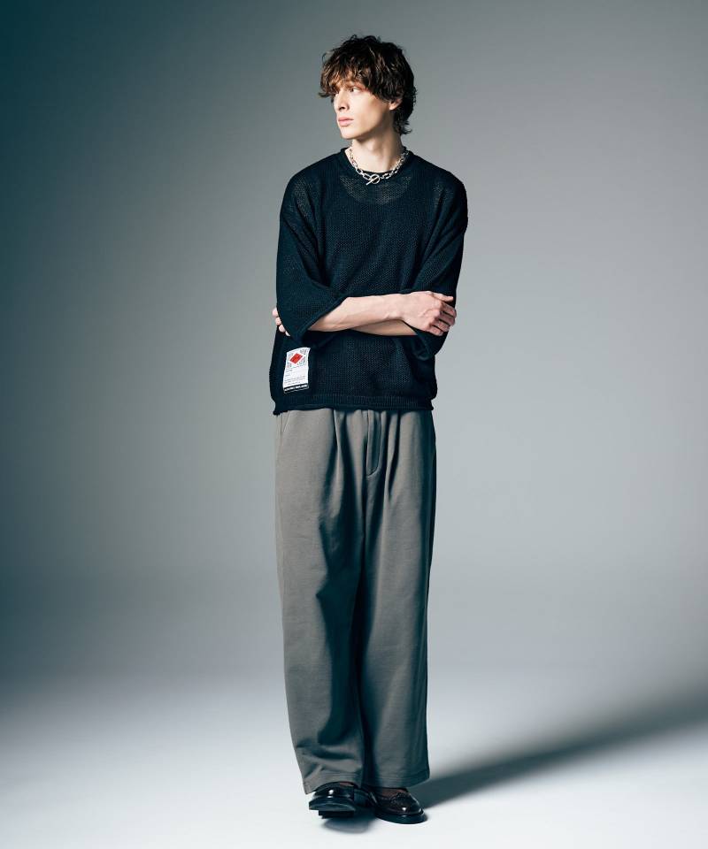 スラックスにイージーな素材使いを掛け合わせ、上品なバケーションスタイルを提案するBaggy Sweat Slacks。シルエットはハイウエストでの着用を想定して股上と股下に余裕を持たせたバギーストレート。腰元に1タックを取った立体仕立てと肉厚なスウェット地との組み合わせが優雅なラインを形作ります。ウエストはベルトループに加えて、内側にドローストリングを設けたゴム仕様でベルトレスの着用が可能。バックポケットにはヌメ革のブランドタグをあしらってリラックス感の中に上質な素材感を潜ませています。