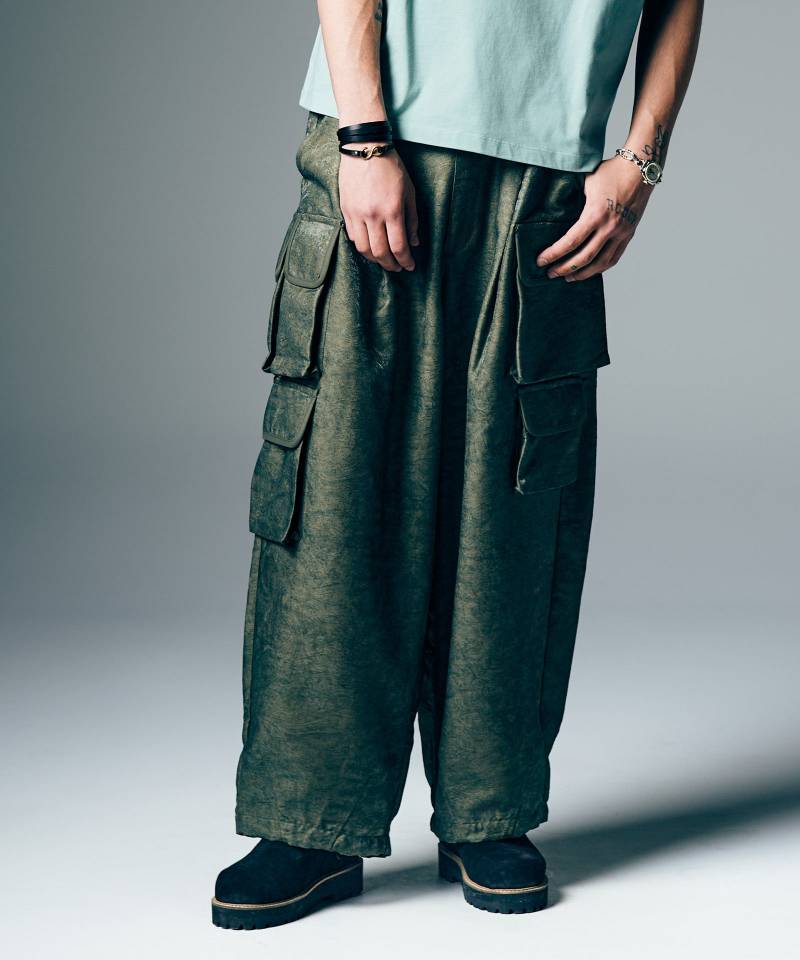 ミリタリーパンツにエレガントなテキスタイルを掛け合わせ、glambならではのラグジュアリーストリートを提案するPaisley Cargo Pants。上品な光沢を見せるテキスタイルは、身生地と同系色でペイズリージャガードを織り上げたライトウェイト生地を使用。カーゴポケットはアシンメトリーに大小3種のサイジングであしらって動きのある佇まいにまとめています。ボディは腰元に1タック、裾に前後2箇所のダーツを施したバルーン状のワイドシルエット。裾内側にはドローコードを配しており、スタイリングに合わせたさらなるアレンジも可能となっております。