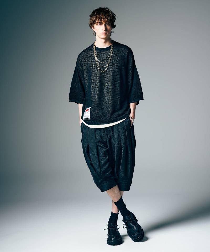 柄とシルエット、そしてディテールが一体となってダイナミックなボトムススタイルを形作るMarble Pleats Cropped Pants。股上を深めに設けたサルエルシルエットのボディは、腰元と裾の左右3箇所ずつに走らせたプリーツによって立体的にボリュームを表現。凹凸ある大柄マーブル生地を落とし込んでサイケデリックなヴィジュアルを作り上げました。シャツのカフスを模したボタン仕立ての裾部分は生地を横使いして柄にさらなる動きを演出。重厚なルックスながらウエストは後ろ身頃をゴム仕様にすることでイージーな着用感にまとめています。