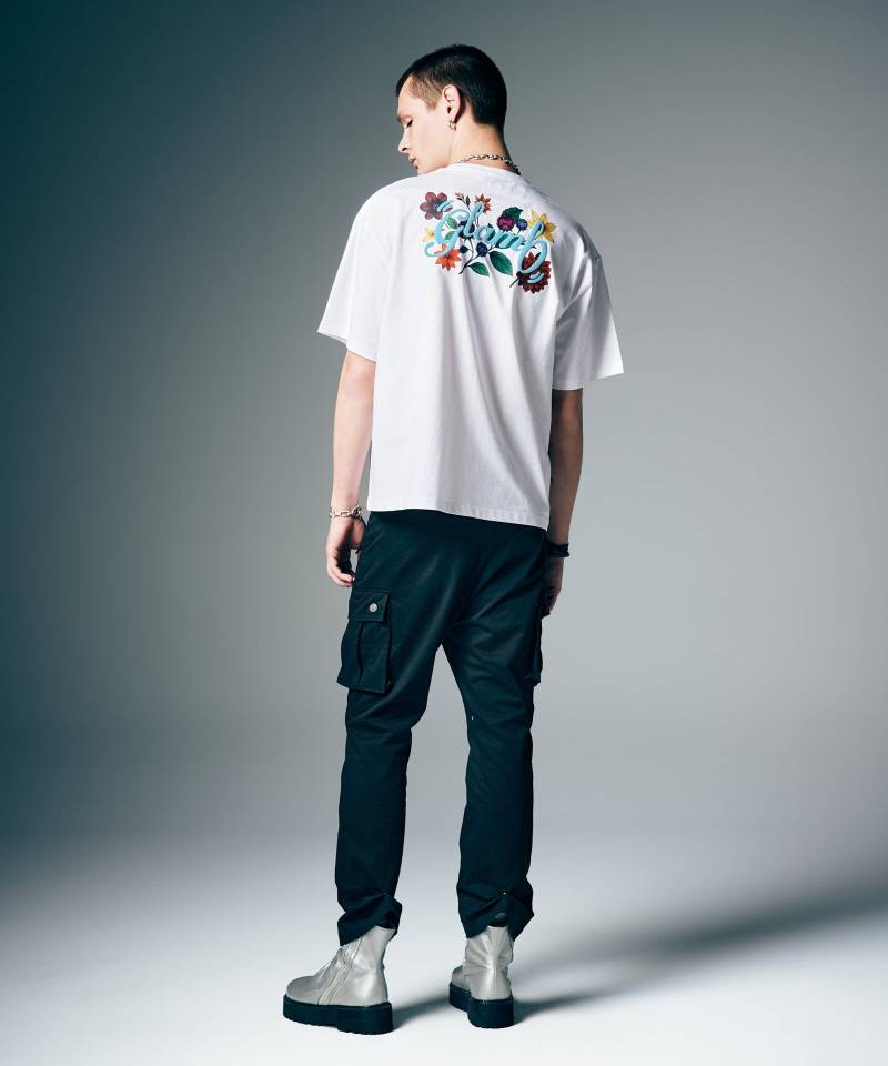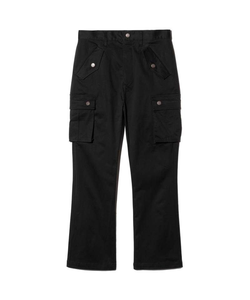 ミリタリーパンツをソリッドなシルエットに刷新、ストリートからエレガントスタイルまでカバーするSarrouel Flare Cargo Pants。タイトフィッティングのボディはサルエルライクな深めの股上と緩やかなフレアラインを組み合わせた真新しいシルエット。前身頃にはブランドオリジナルボタンを用いたフラップポケットとカーゴポケットをそれぞれ左右2箇所ずつ配してヴィンテージ調のムードを加えています。後ろ裾にはスナップボタンを備えてロールアップへのアレンジもアシスト。テキスタイルにはストレッチ混のライトウェイトチノ生地を用いており春夏らしい軽さあるは着心地にまとめています。