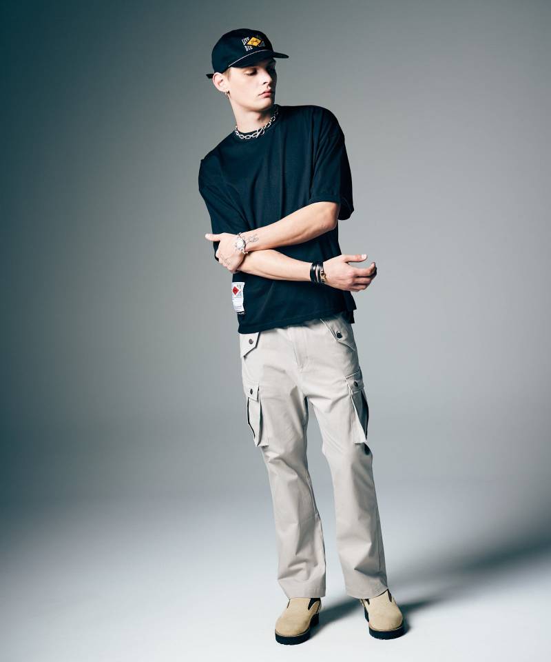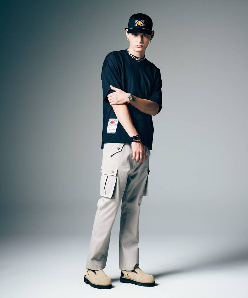 ミリタリーパンツをソリッドなシルエットに刷新、ストリートからエレガントスタイルまでカバーするSarrouel Flare Cargo Pants。タイトフィッティングのボディはサルエルライクな深めの股上と緩やかなフレアラインを組み合わせた真新しいシルエット。前身頃にはブランドオリジナルボタンを用いたフラップポケットとカーゴポケットをそれぞれ左右2箇所ずつ配してヴィンテージ調のムードを加えています。後ろ裾にはスナップボタンを備えてロールアップへのアレンジもアシスト。テキスタイルにはストレッチ混のライトウェイトチノ生地を用いており春夏らしい軽さあるは着心地にまとめています。