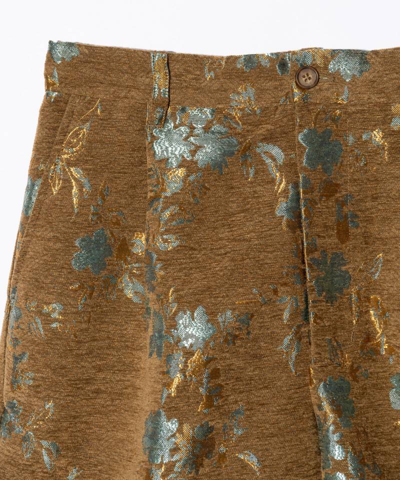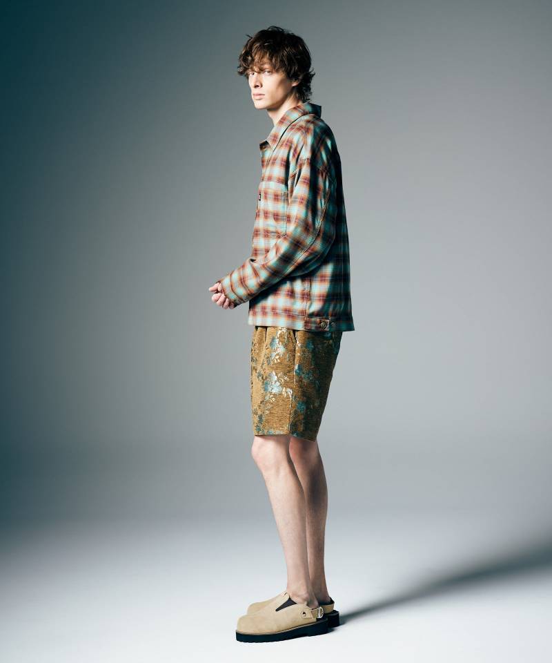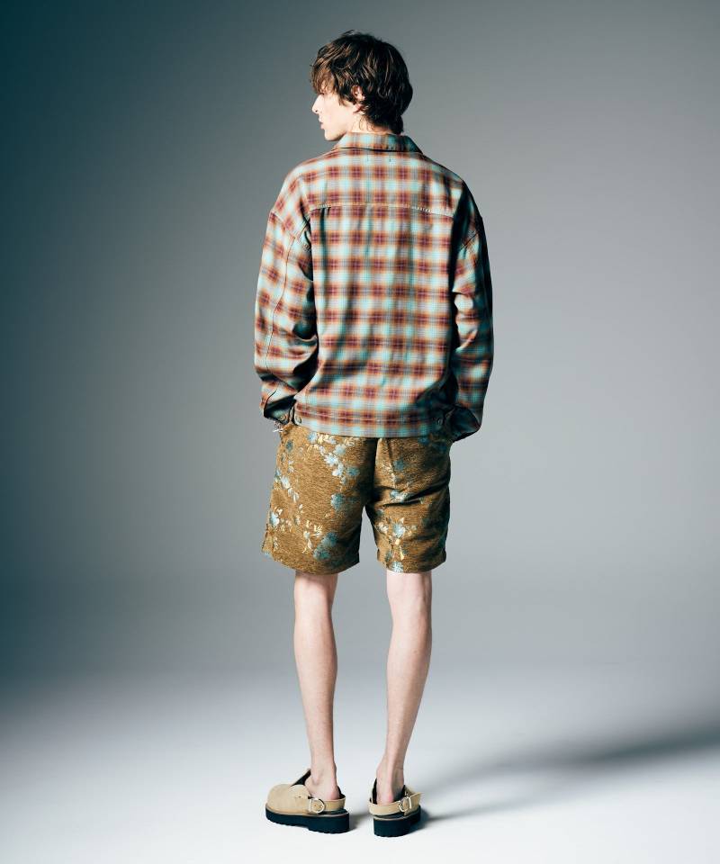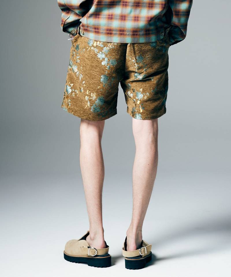異国情緒を感じさせる重厚なテキスタイルを、軽さあるショーツスタイルへ掛け合わせたGobelin Easy Shorts。腰元に1タックを配したボディは膝上丈のコンパクトなシルエット。そこに凹凸あるモール糸で織り上げたゴブランジャカード生地を落とし込むことで、ボヘミアンライクなムードを演出しました。ウエストはベルトループを備えつつ、後身頃にギャザーゴム、内側にドローコードを配したベルトレス仕様。Blackはダマスク柄、Beigeは光沢感のある花柄と、カラーバリエーション毎に異なる柄使いは“Wandermore”という今季のglambのテーマを反映したセレクトとなっています。