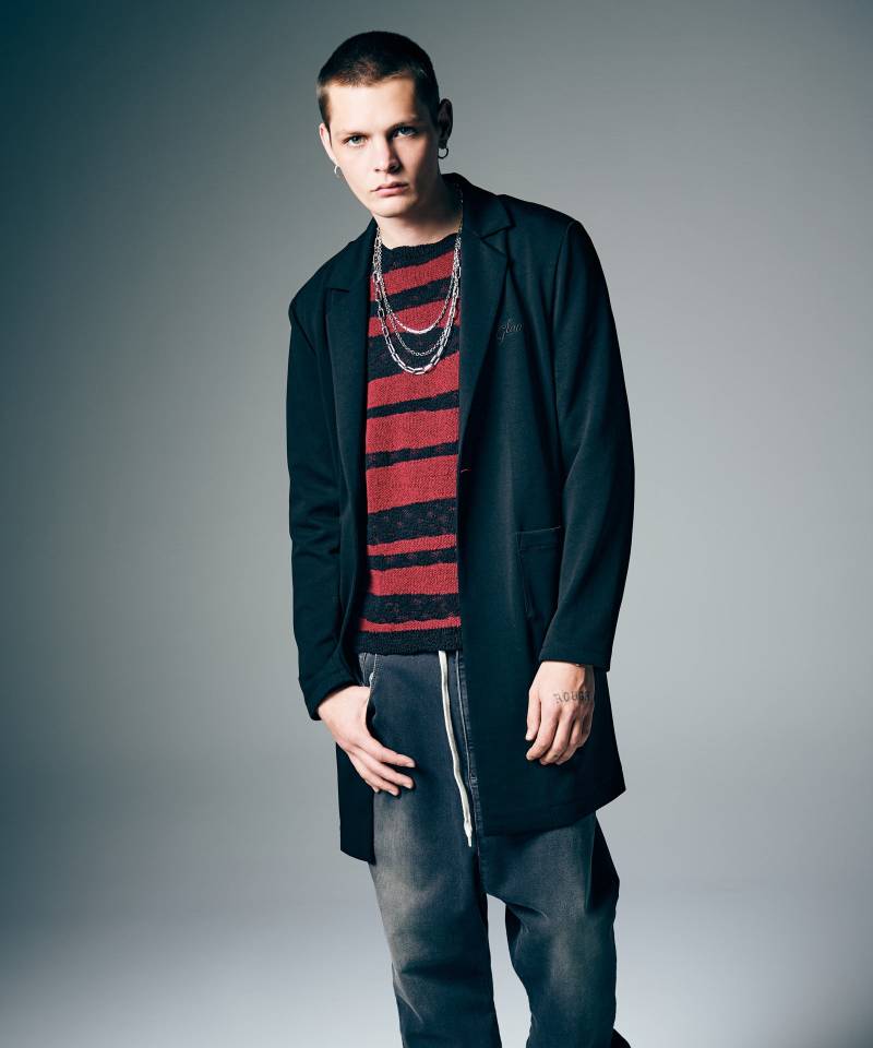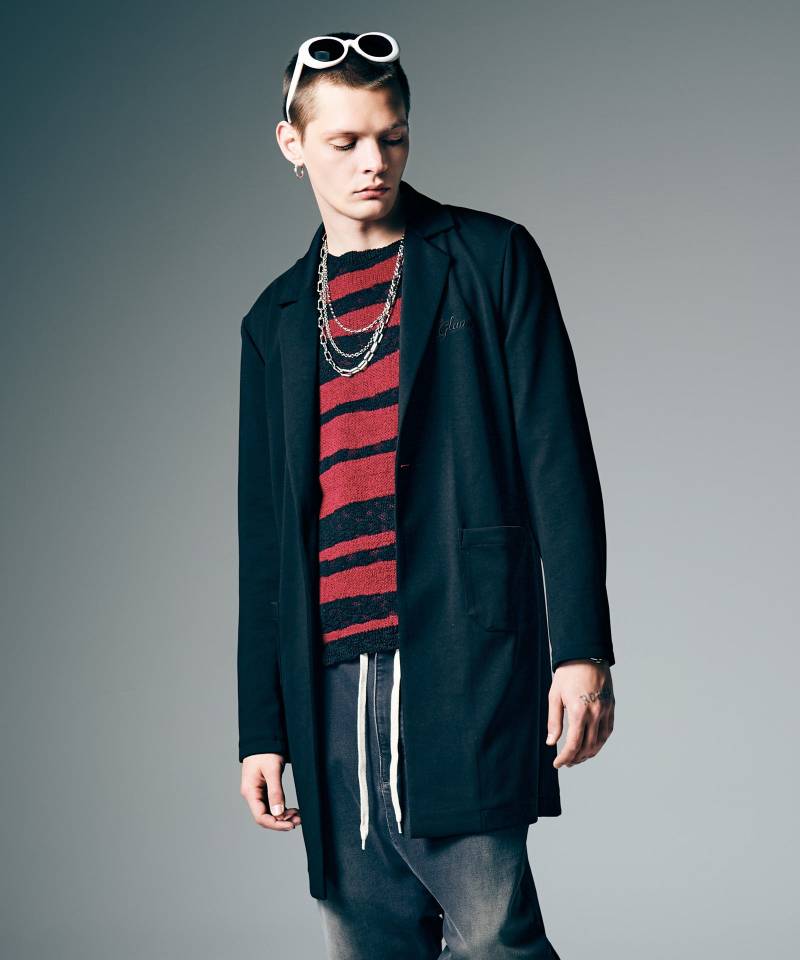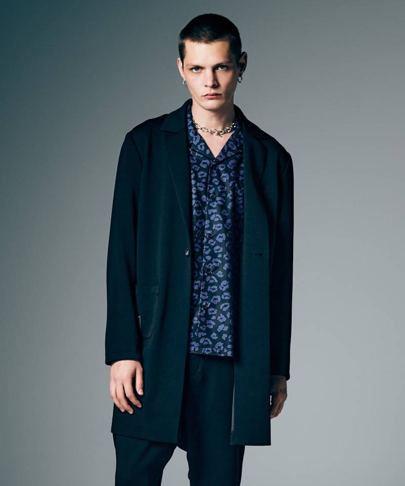 トラッドなコートシルエットを軽やかな素材使いとともにセットアップスタイルでストリートに提案するChesterfield Shirt Set Up。トップスは襟にノッチドラペル、バックスタイルにセンターベントをあしらったチェスターコートを思わせるロングシルエット。そこにスポーティなジャージ生地をあしらうことでイージーなムードへとカジュアルダウン。腰元のポケットもカジュアルなムードのアウトポケットで配し、フォーマルに傾き過ぎないルーズなムードにまとめています。同生地を使用したボトムスはクロップド丈のテーパードシルエット、股下にパネル使いでマチを設けたアクティブな立体仕立てとなっています。そこに腰元から膝脇にかかる特大のタックや裾半身のリブ切り替えをあしらって、ミニマルなルックスの中にアーバンなアヴァンギャルド性を潜ませました。