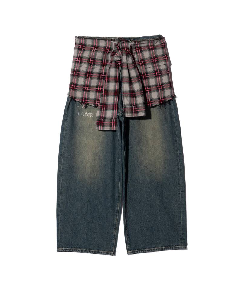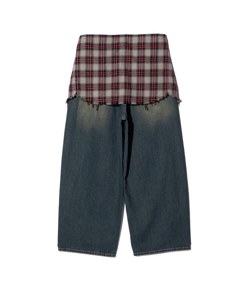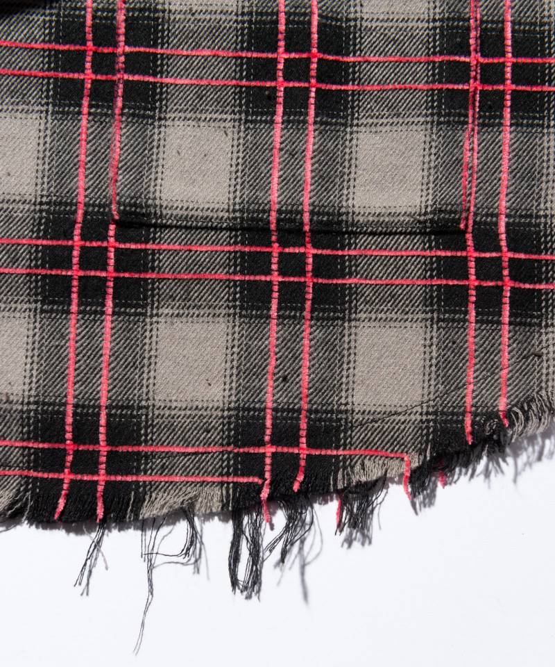 腰巻きシャツをインスピレーションに、バッグの進化系を提案するCheck Shirt Bag。ベルトループを付属したボディは左右に2つずつジップポケットとフラップポケットを備えたもの。腰に着用するのはもちろんのこと、袖に見立てたパーツを広げれば斜めがけしてショルダーバッグとしてもご使用いただけます。コットン100%のテキスタイルは手ですいた後に製品洗いをかけてダメージ加工。ハードコアながら生地段階でチェック柄に合わせてモール糸をステッチし、ギャップあるアクセントを付けています。